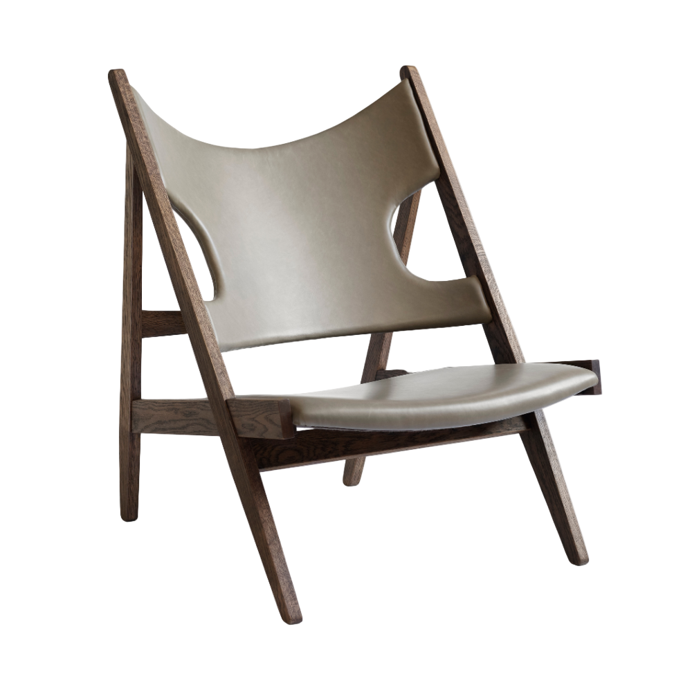 Fauteuil KNITTING grijs leer met een donkere eiken basis