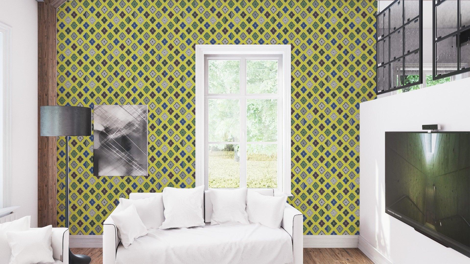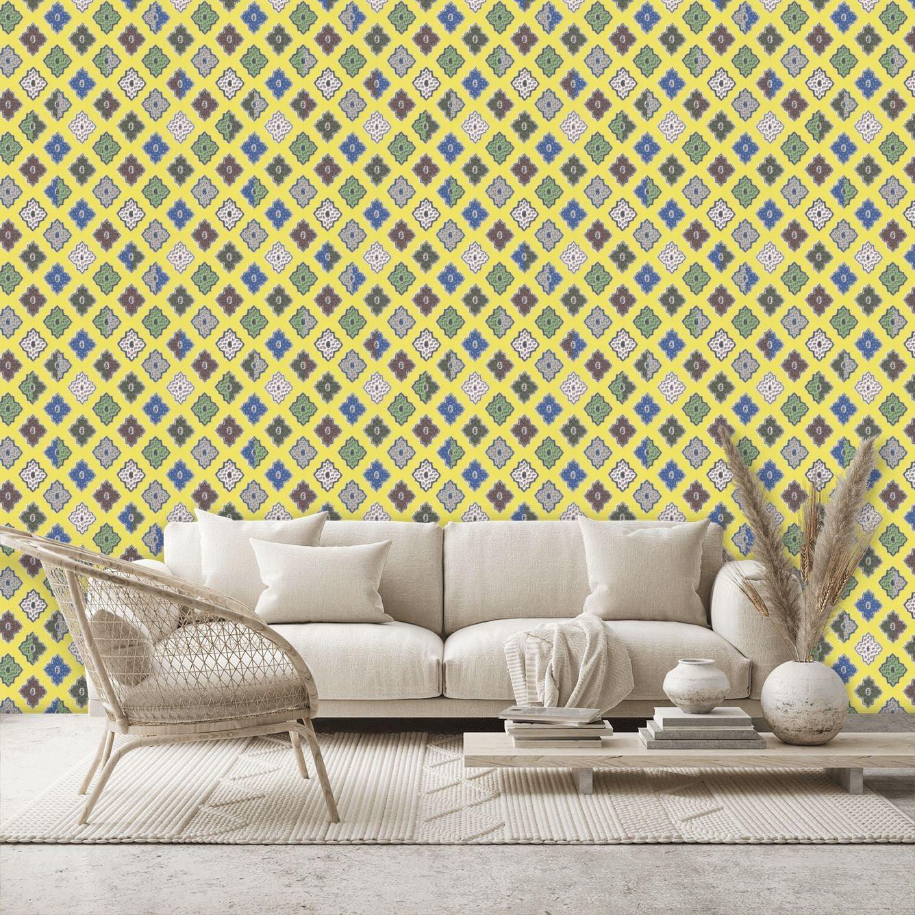 Bringen Sie die Essenz des provenzalischen Stils in Ihr Zuhause mit der Tapete Alcazar - Safran in einem Gelbton. Diese auffällige, mehrfarbige Tapete mit Druck strahlt den Charme des südlichen Frankreichs aus. Die gelbe Tapete präsentiert sich auf verschiedenen schönen matten, schimmernden und metallischen Untergründen und verleiht dem Raum außergewöhnliche Tiefe und Farbvielfalt. Lassen Sie Alcazar - Safran Sie in die malerischen Landschaften der Provence entführen und fügen Sie Ihrem Raum einen künstlerischen Charakter und eine warme mediterrane Atmosphäre hinzu.