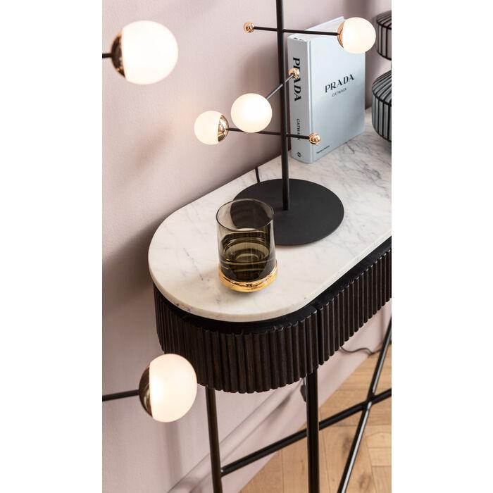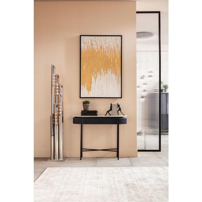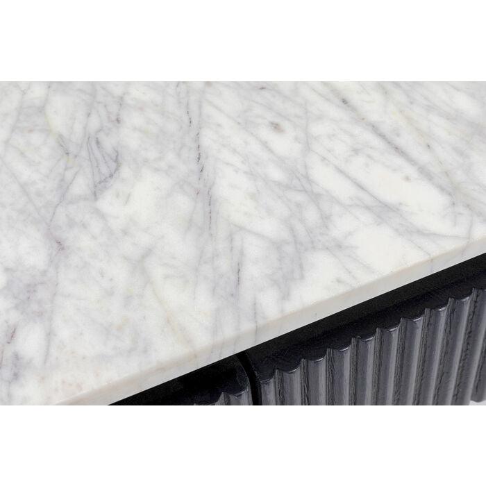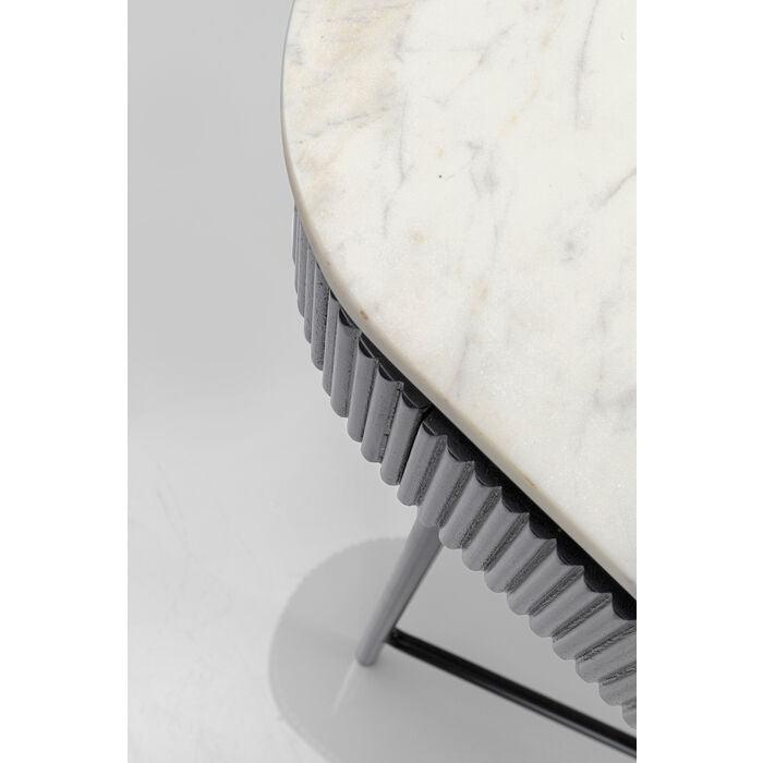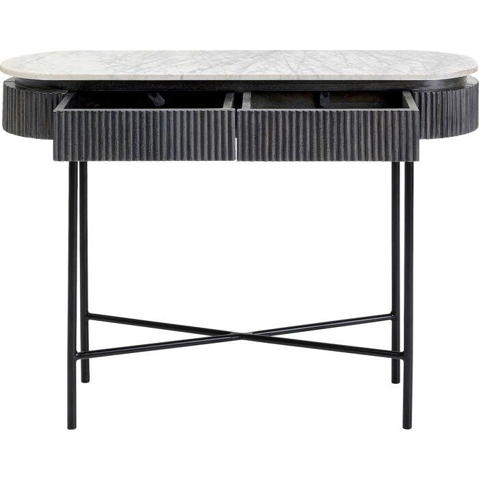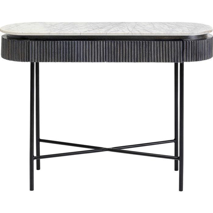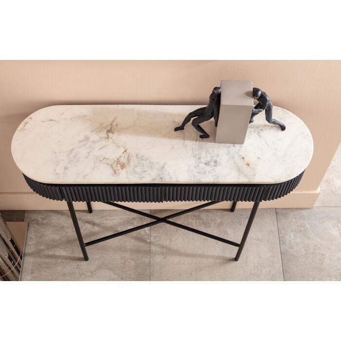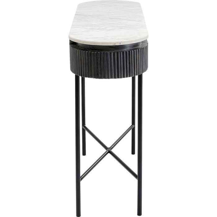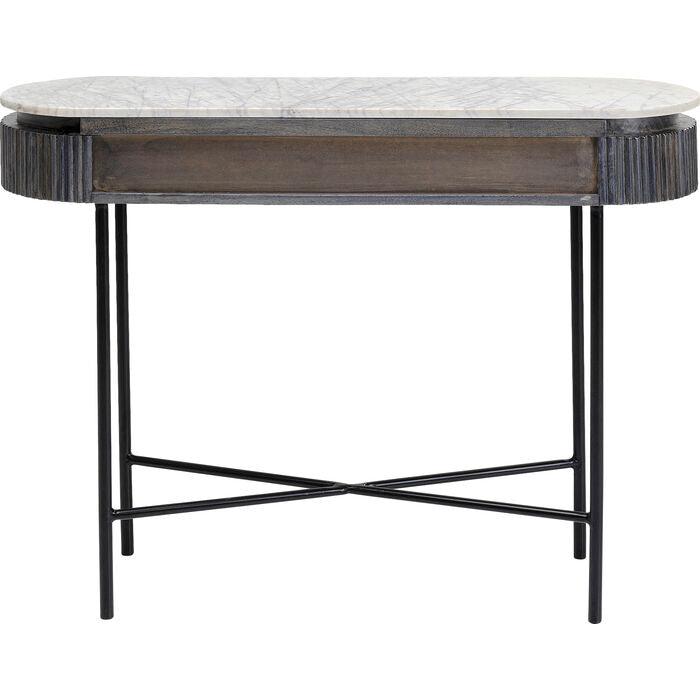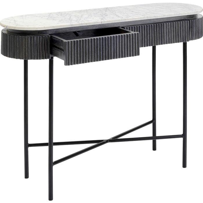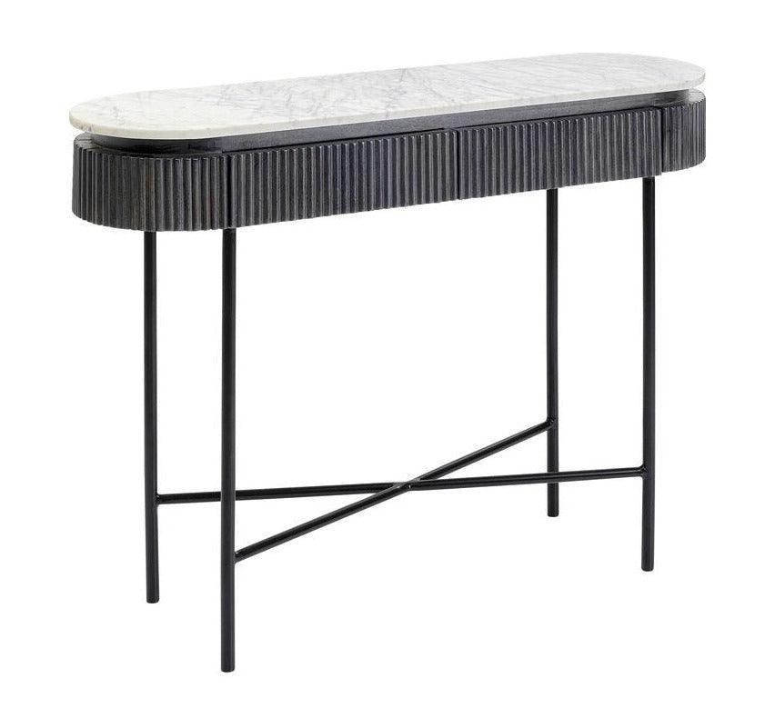 Elegante Konsole für den Flur mit einer hellen Marmorplatte und einem dunkelgrauen Korpus aus massivem Holz auf einem filigranen Stahlrahmen in Schwarz. Edelmütig und außergewöhnlich - diese Konsole für den Flur sehnt sich nach mehr. Flache Ovale, die Oberfläche der Platte aus hellem, echtem Marmor und ein Korpus, der sich unter den Konsolen durch dunkelgraue Fronten und Seiten aus massivem Holz mit geriffeltem Aussehen abhebt - Glenn strahlt diskrete Edelmütigkeit und zeitlose Eleganz aus. Die Tischplatte besteht aus Marmor, der Korpus der Schublade aus lackierter MDF-Platte, das Gestell aus pulverbeschichtetem Stahl und die Fronten der Schubladen aus lackiertem Mangoholz.