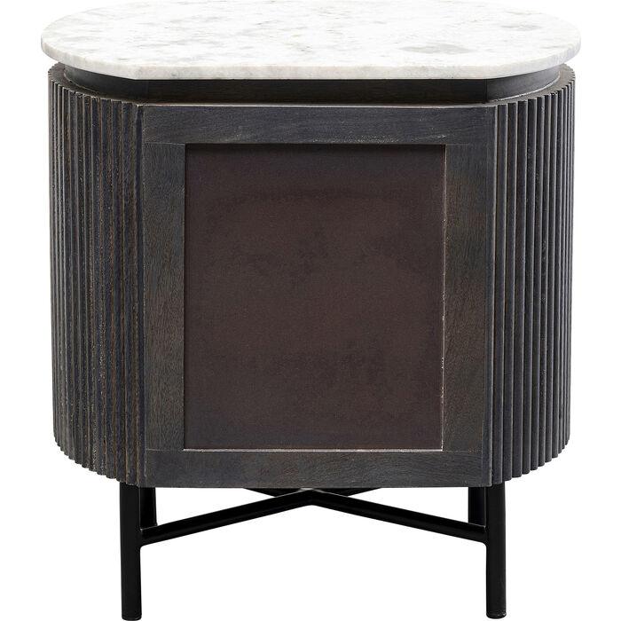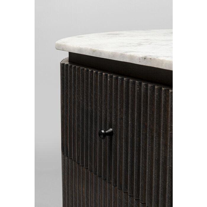Körper und Fronten: Festes Mangoholz, gefärbt und lackiert, hintere Tafel: Mitteldichte Faserplatte (MDF) Lackiert, obere Platte: Naturstein Marmor, Beine/Basi (MDF) lackiert, Plattendicke: 15 mm