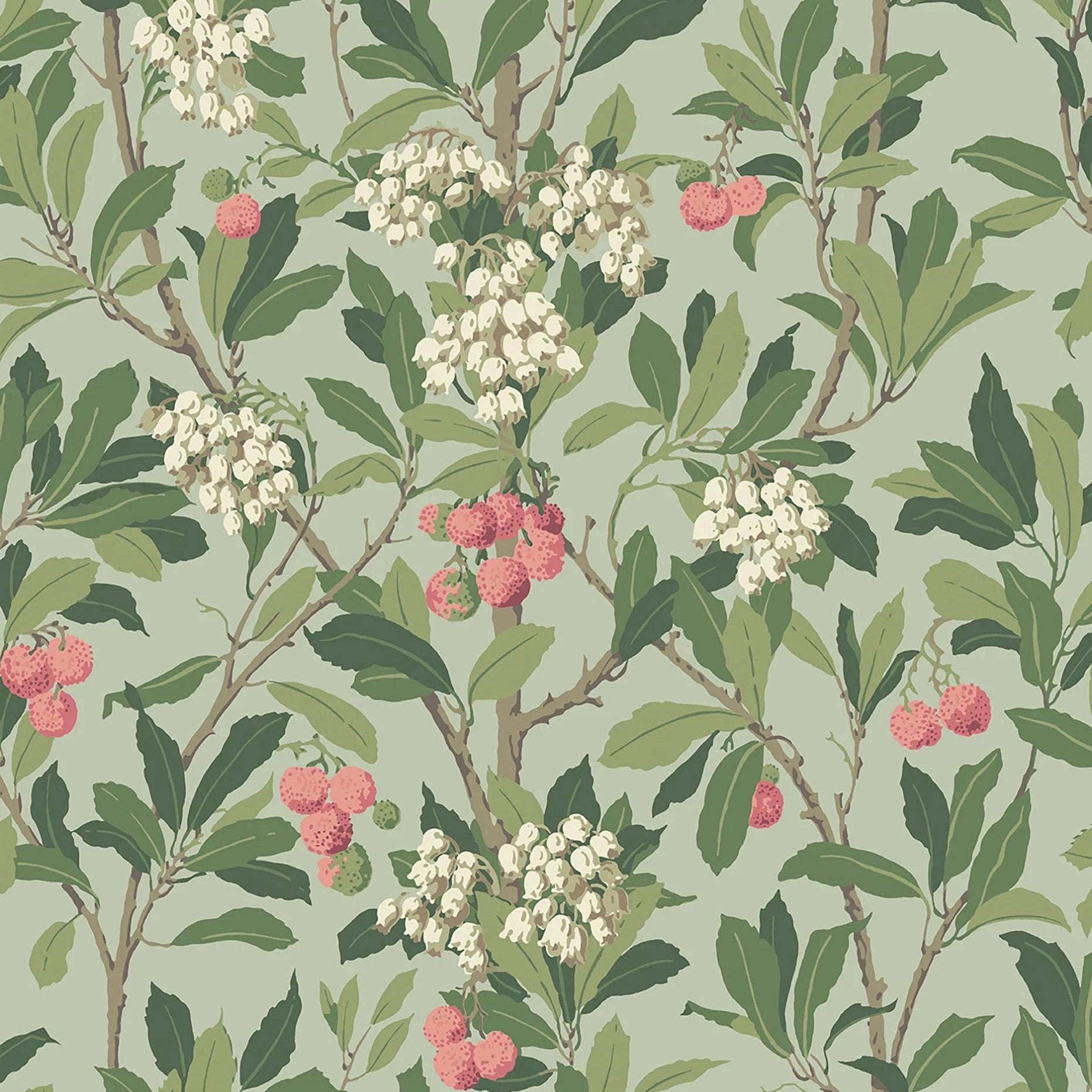 Tapete mit pflanzlichem Motiv von Früchten und Blättern ARCHIVE ANTHOLOGY - Erdbeerbaum rosa auf hellem Grün