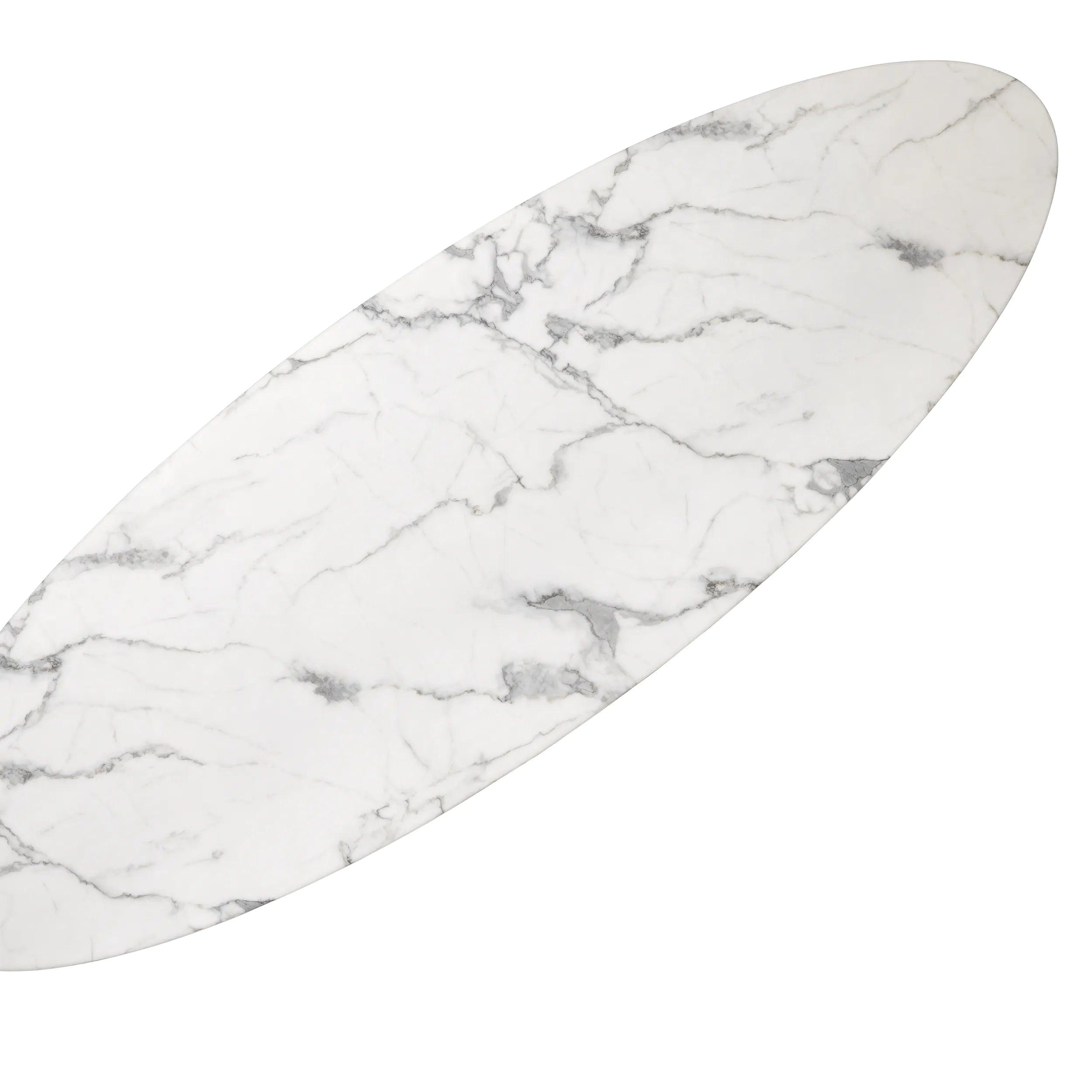 Das zentrale Element der Tabelle ist ein ovales Oberteil, das ihm Delikatesse und Harmonie verleiht. Weißer künstlicher Marmor, auf dem die Arbeitsplatte ruht, verleiht ihm einen luxuriösen Look, der an einen echten Stein erinnert, aber gleichzeitig seinen eigenen einzigartigen Charakter im Inneren einführt. Das Oberteil ruht mit zwei soliden dreieckigen Blöcken, die nicht nur stabile Unterstützung, sondern auch dekorative Elemente sind. Ihre geometrische Form steht im Gegensatz zum flüssigen Oval der Arbeitsplatte und erzeugt ein interessantes Spiel von Formen und Proportionen.