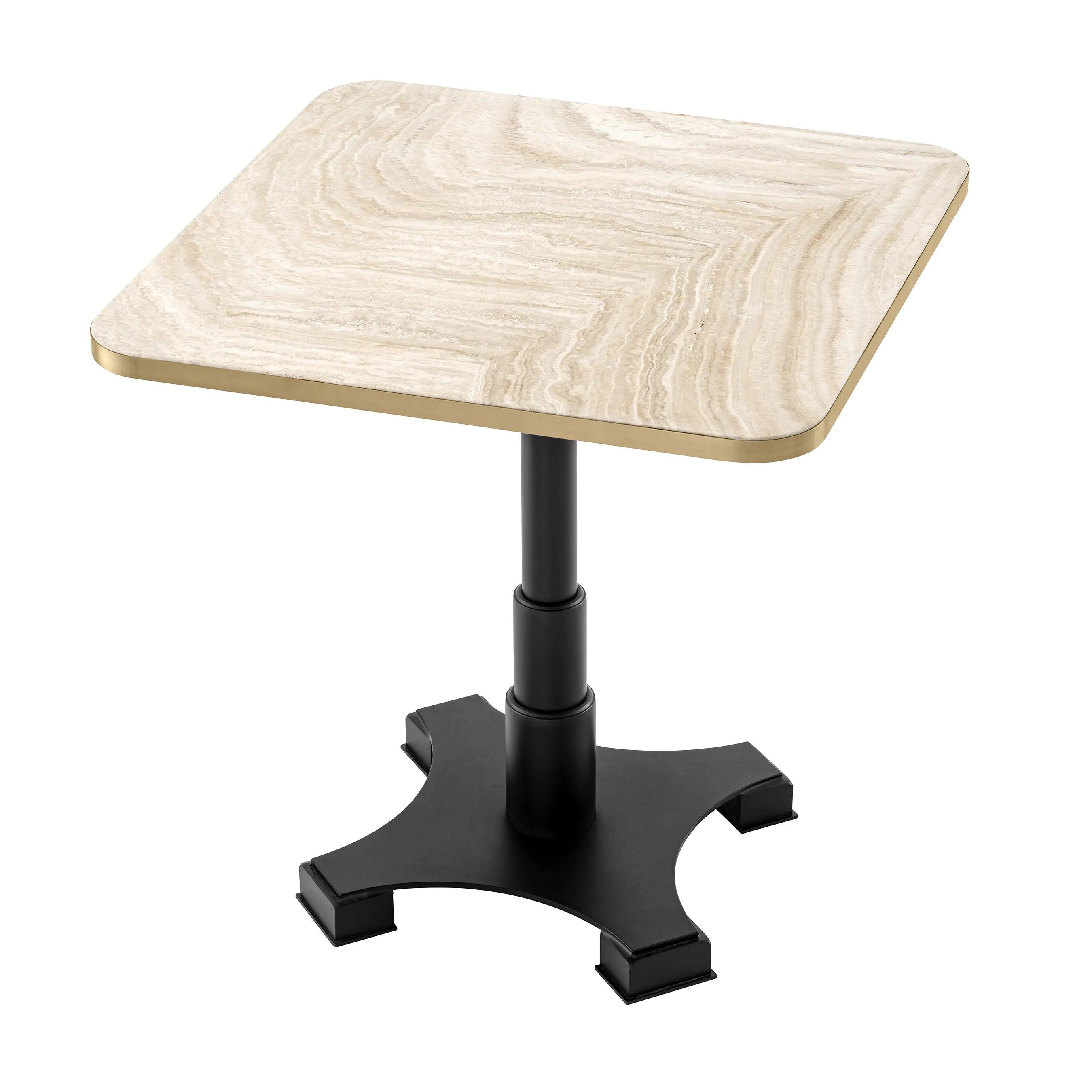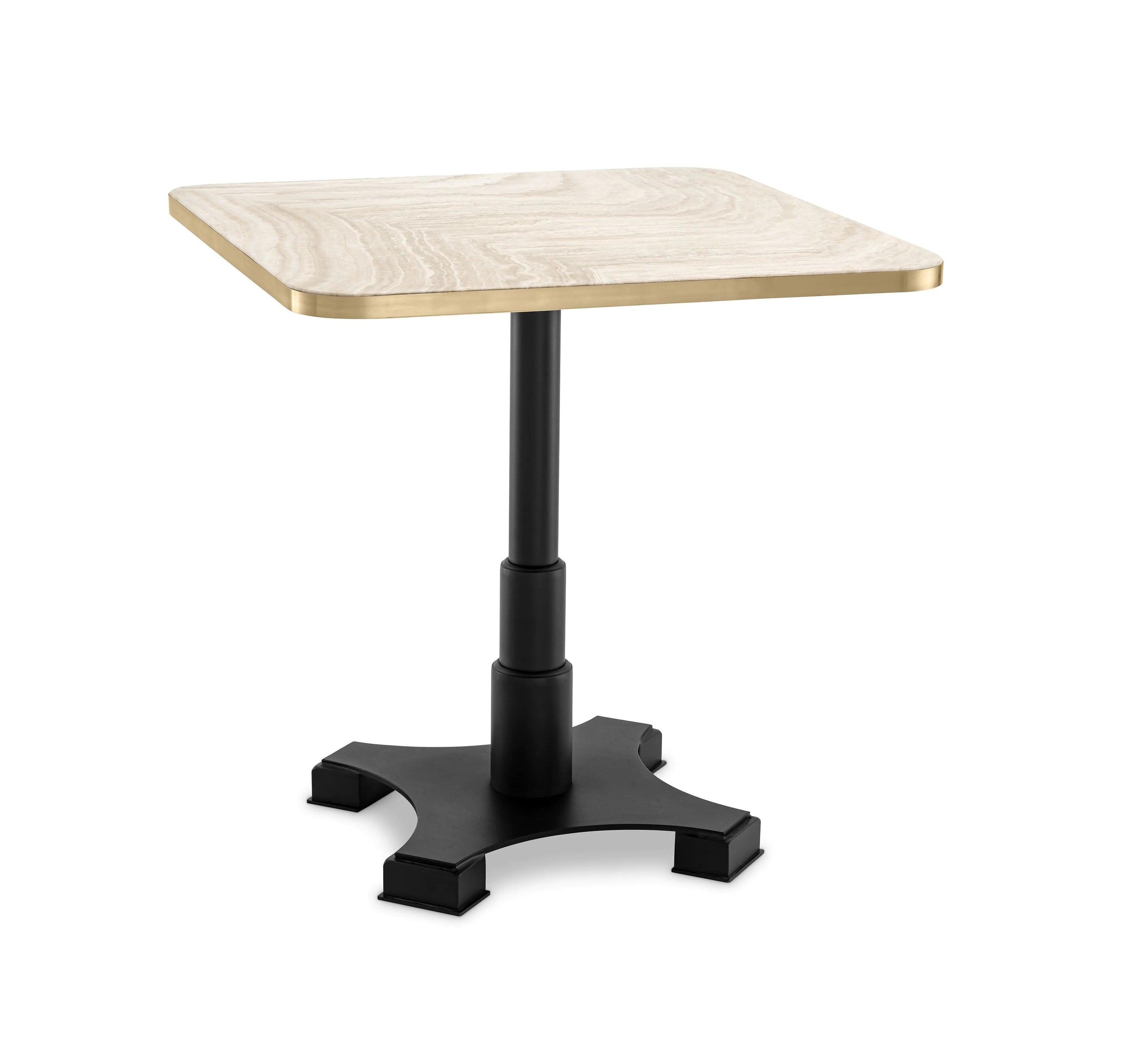 Esstisch Avoria vereint modernes Design mit der Nostalgie klassischer Bistromöbel. Das wahre Juwel dieses Möbelstücks ist die natürliche Tischplatte aus Travertin, einem Stein, der für seine einzigartigen Verzierungen und Langlebigkeit geschätzt wird. Die gebürstete Messingkante verleiht Glanz und Eleganz und bringt einen Hauch von Luxus in den Alltag.