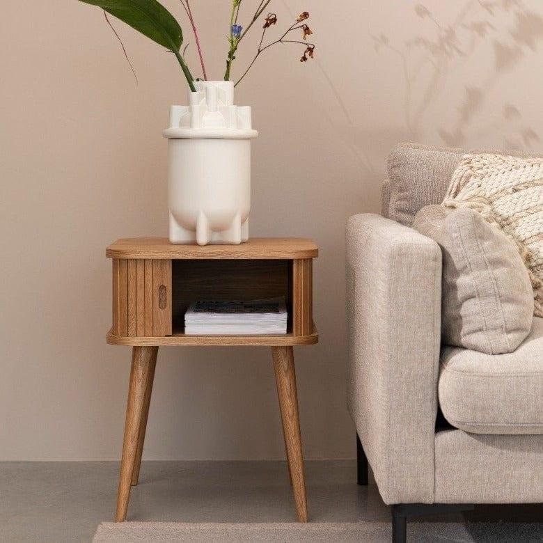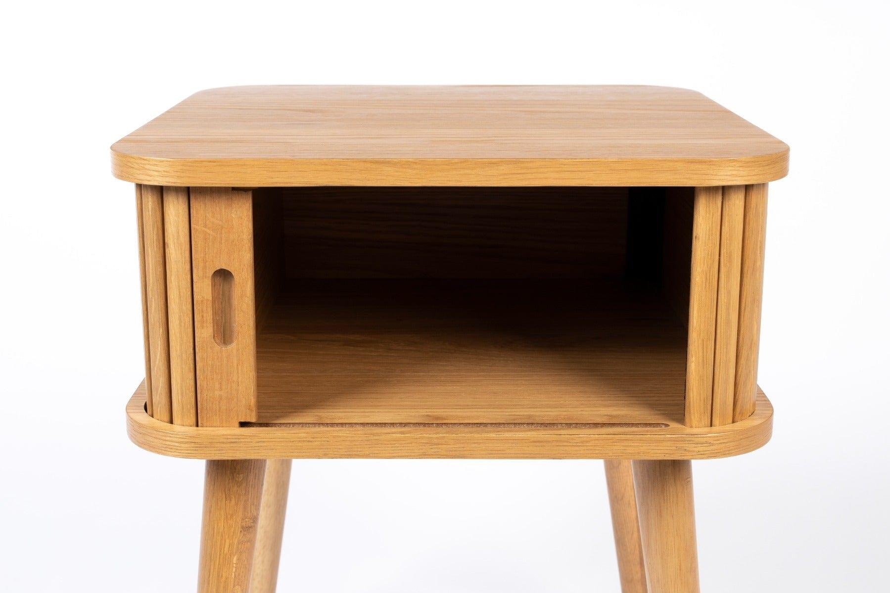 Barbier ist ein stilvoller, holziger Beistelltisch, der im Retro-Stil gehalten ist. Die außergewöhnlichen, rolladenartig schließenden Türen verleihen dem Gesamtbild nicht nur einen einzigartigen Charakter, sondern ermöglichen es auch, notwendige Kleinigkeiten zu verstauen.