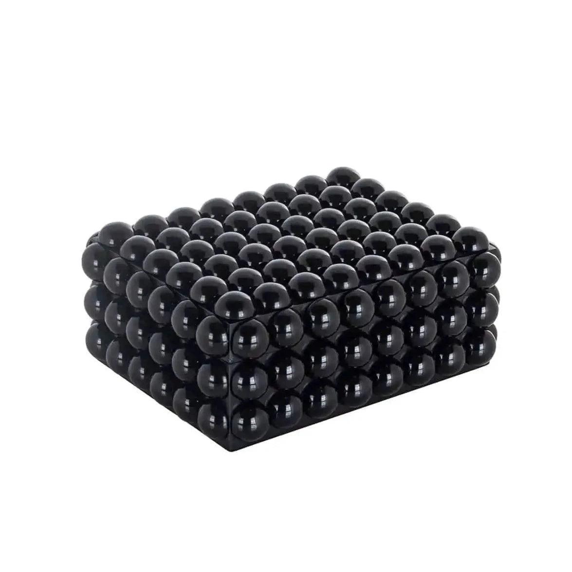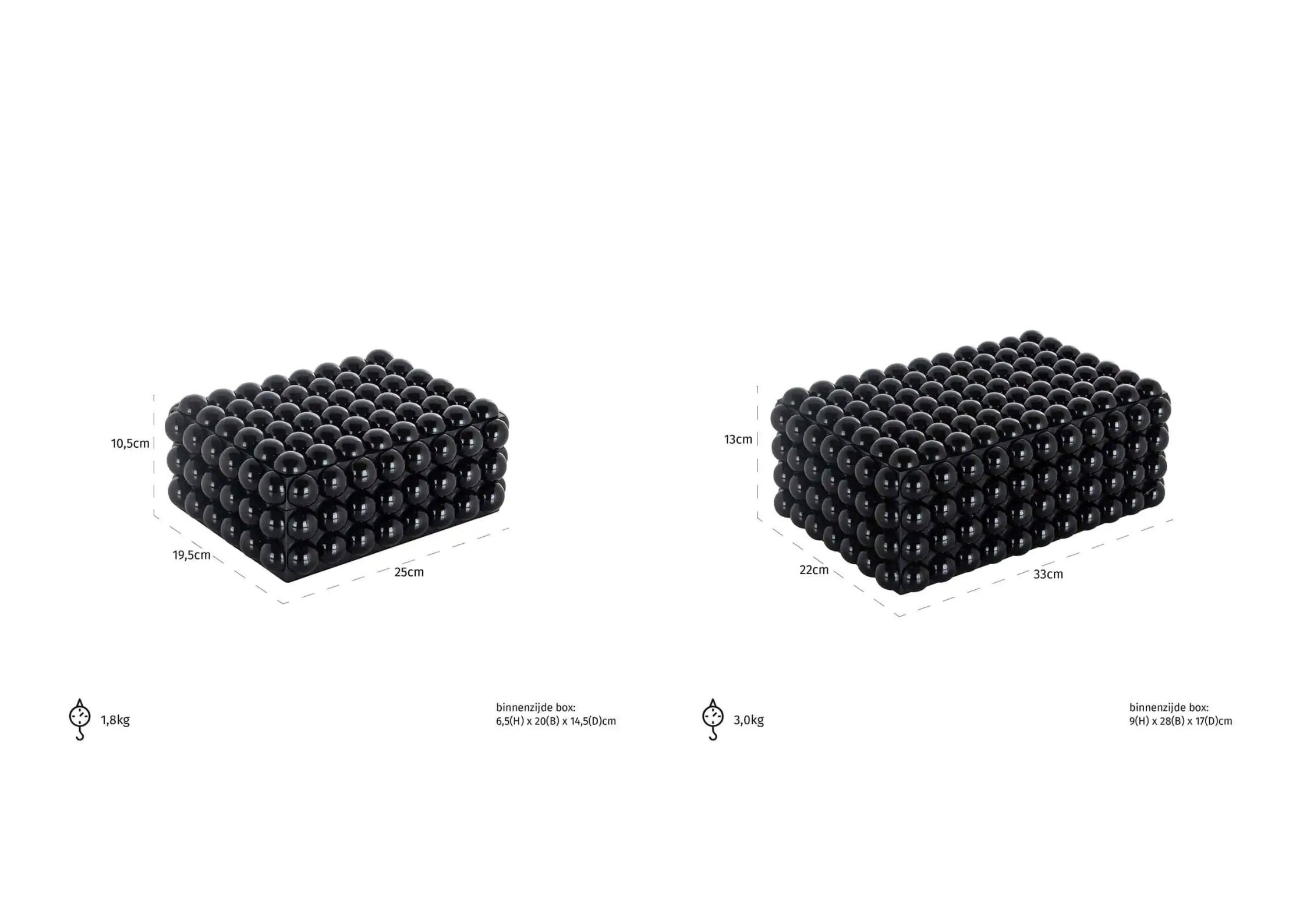 Kasten Batool in Black ist eine elegante und stilvolle Lösung, um Ihren Schmuck und wertvolle Accessoires aufzubewahren. Seine rechteckige Form in Kombination mit Elementen, die an Blasen erinnern, verleiht ihm einen einzigartigen Charme und führt ein wirklich feenhaftes Element in den Raum ein.