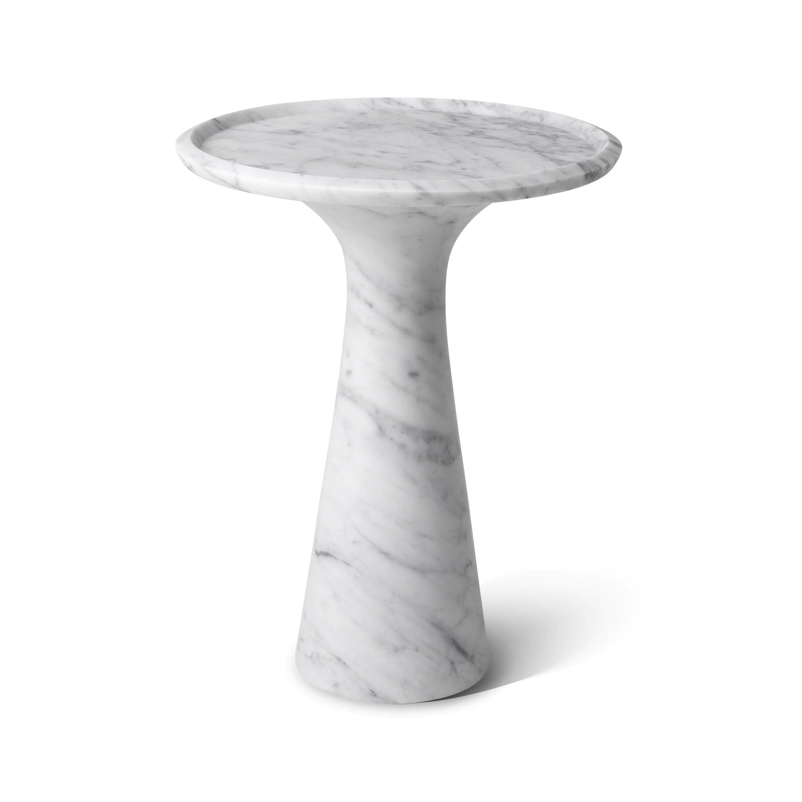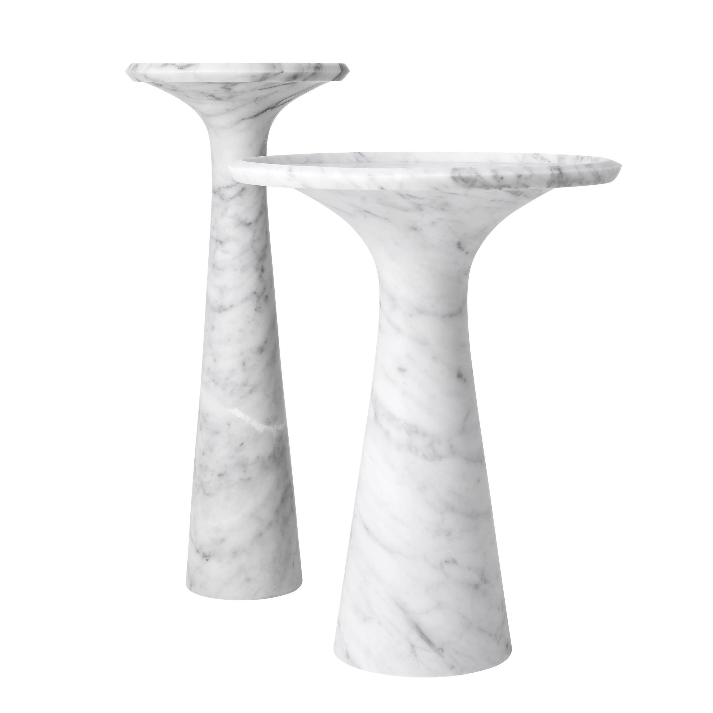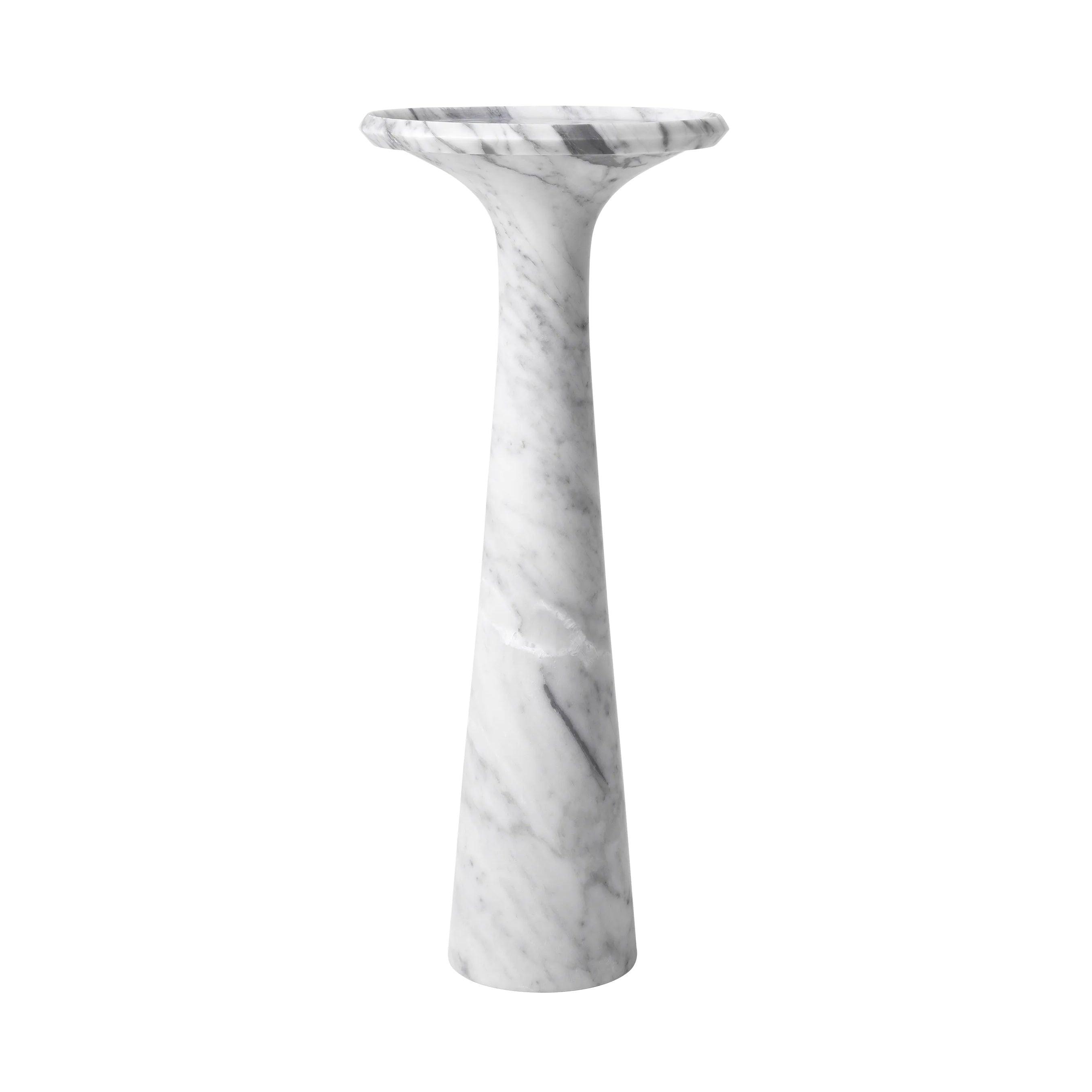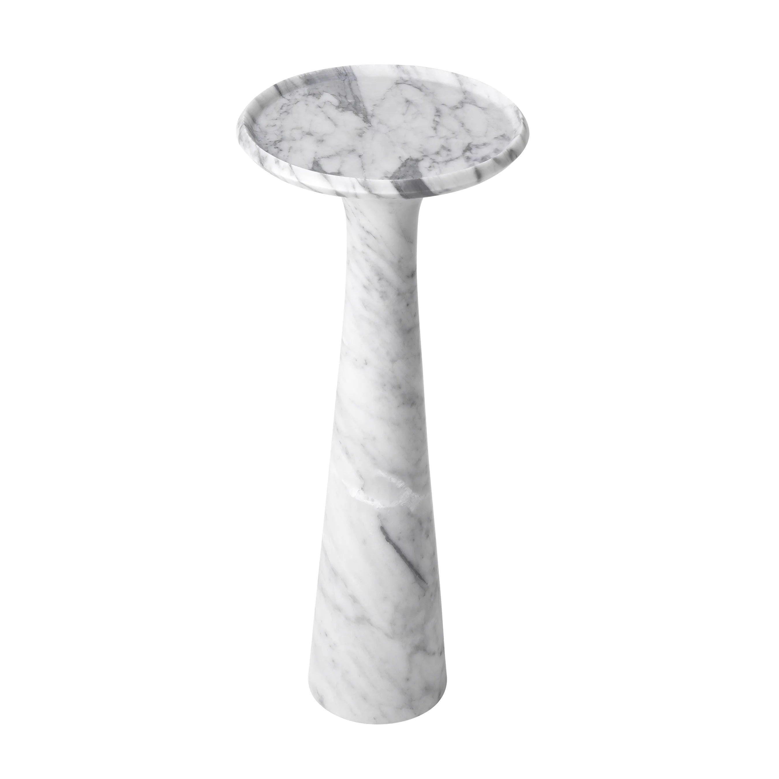 Dieser Tisch, aus einem Stück massivem italienischen Marmor geschnitzt, beeindruckt durch sein Gewicht und seine Stabilität. Gleichzeitig verleihen ihm seine sanft abgerundeten Formen und die erhöhte Kante einen subtilen Charme. Der weiße Marmor mit zarten grauen Adern verleiht ihm Tiefe und Charakter, wodurch jedes Exemplar einzigartig wird. Einer der größten Vorteile des Pompano-Tisches ist seine Vielseitigkeit. Die hohe Version des Tisches harmoniert perfekt mit dem niedrigen Modell und schafft ein elegantes und harmonisches Set. Nebeneinander aufgestellt bieten sie nicht nur einen funktionalen Raum zum Lagern und Servieren, sondern sind auch ein raffiniertes zentrales Element jedes Interieurs.