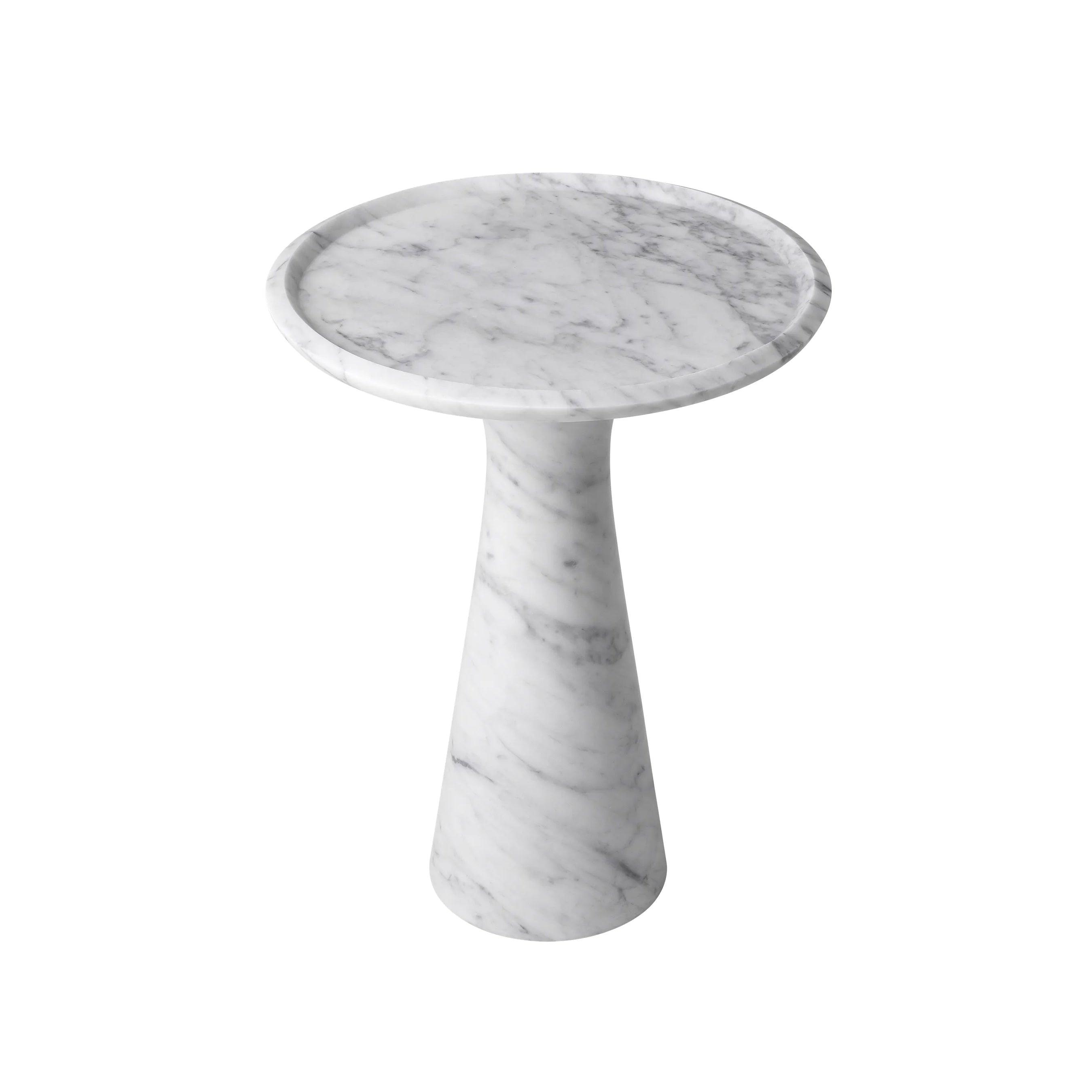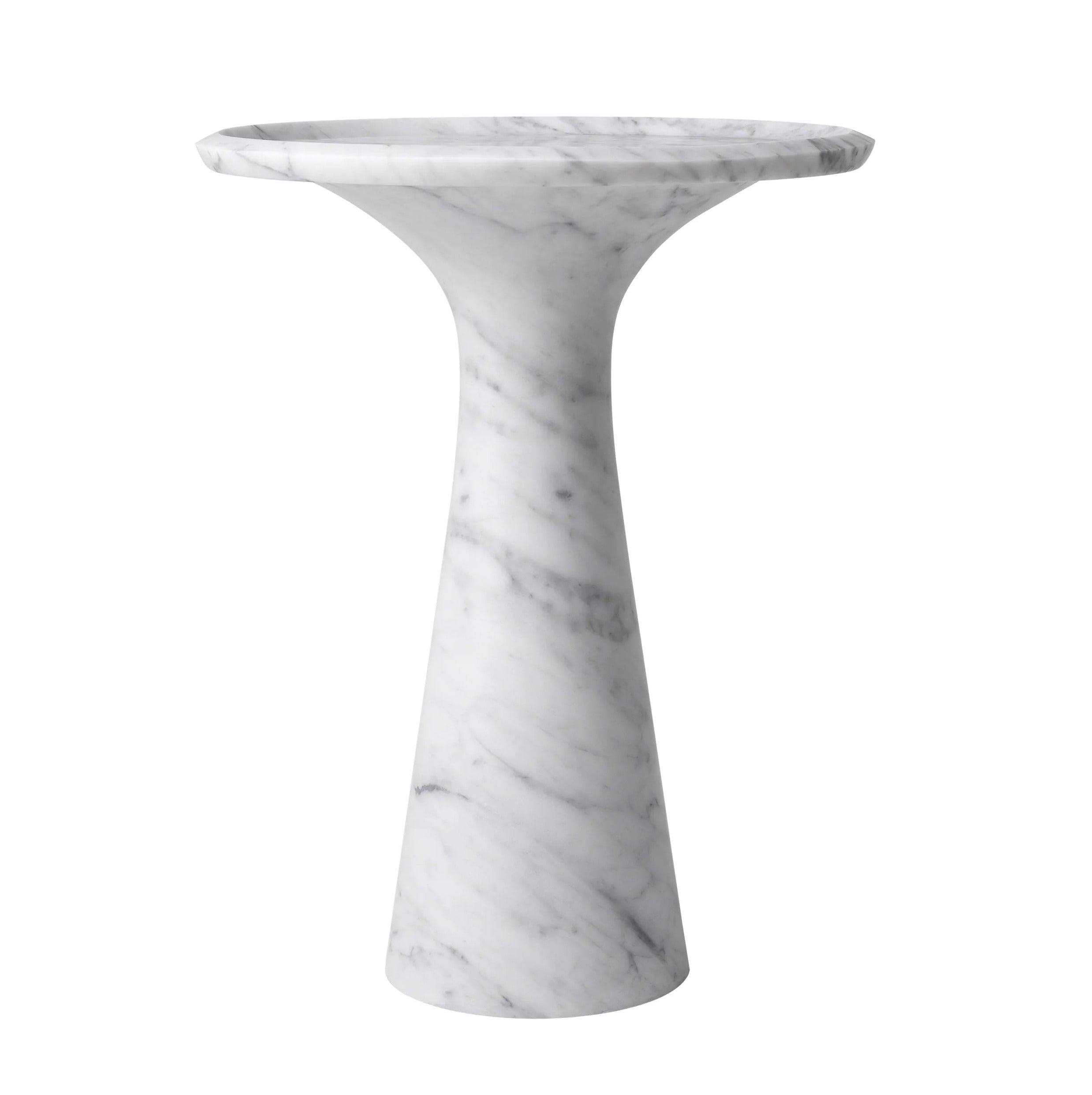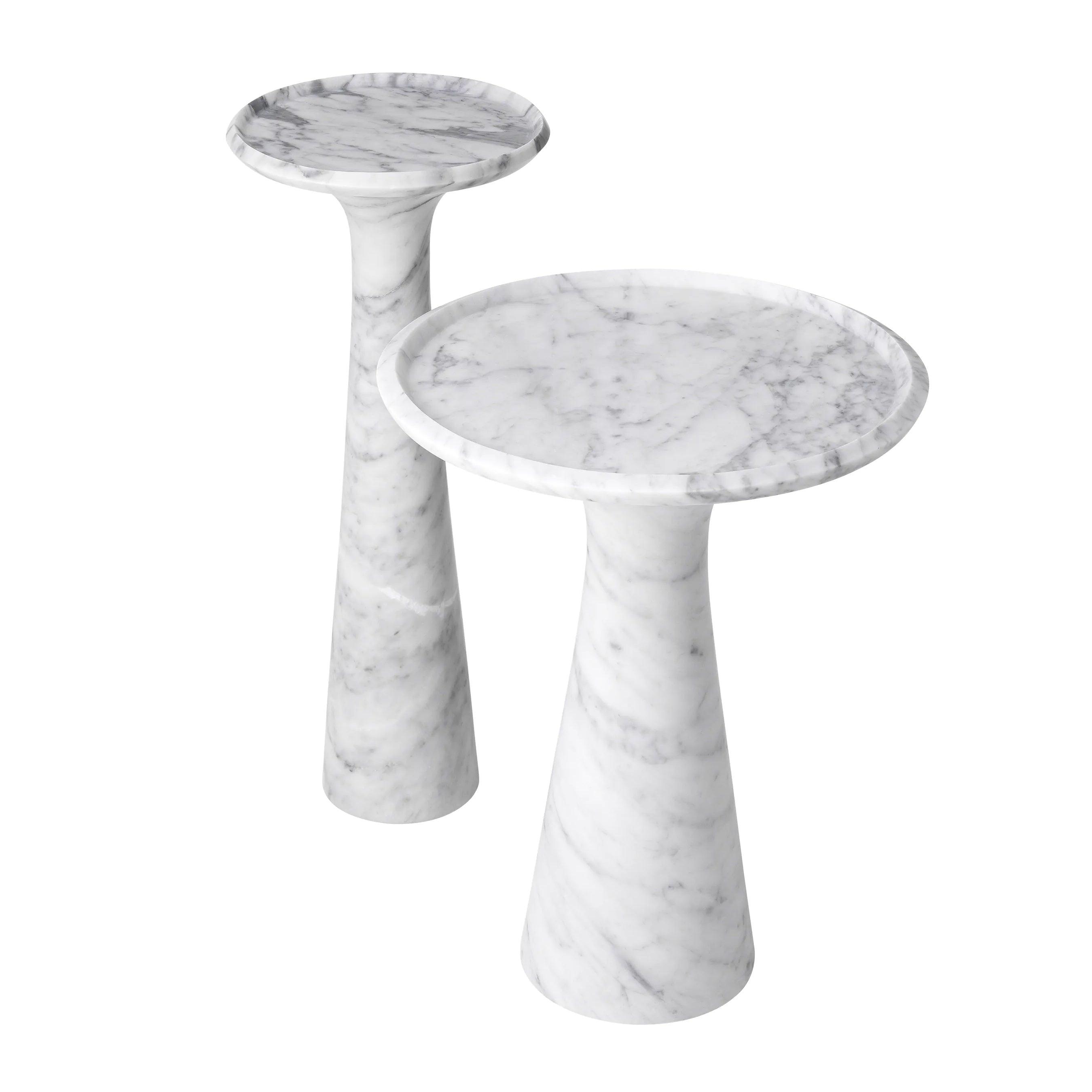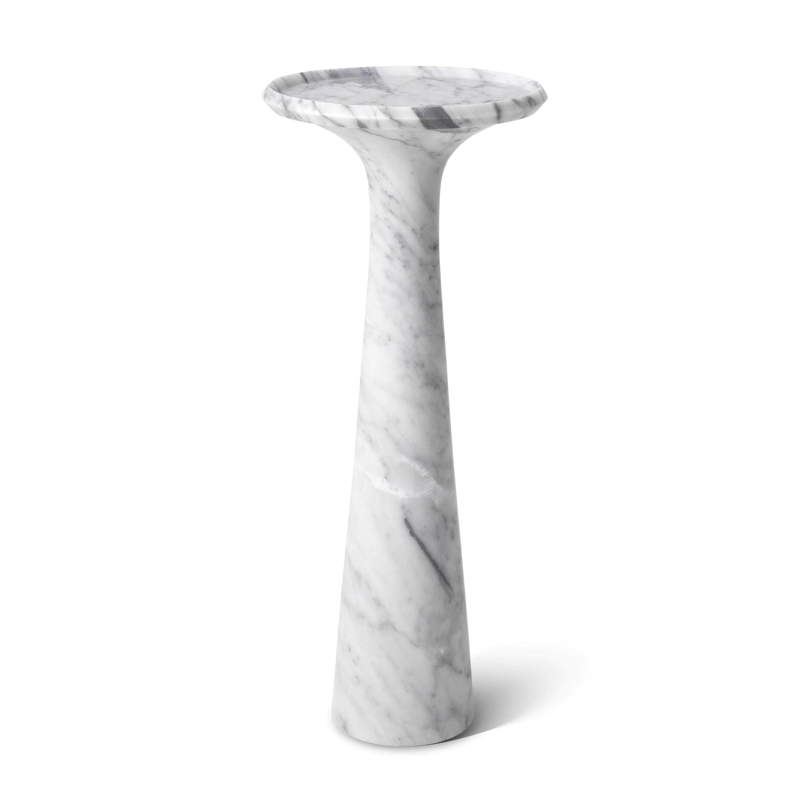 Dieser Tisch, aus einem Stück massivem italienischen Marmor geschnitzt, beeindruckt durch sein Gewicht und seine Stabilität. Gleichzeitig verleihen ihm seine sanft abgerundeten Formen und die erhöhte Kante einen subtilen Charme. Der weiße Marmor mit zarten grauen Adern verleiht ihm Tiefe und Charakter, wodurch jedes Exemplar einzigartig wird. Einer der größten Vorteile des Pompano-Tisches ist seine Vielseitigkeit. Die hohe Version des Tisches harmoniert perfekt mit dem niedrigen Modell und schafft ein elegantes und harmonisches Set. Nebeneinander aufgestellt bieten sie nicht nur einen funktionalen Raum zum Lagern und Servieren, sondern sind auch ein raffiniertes zentrales Element jedes Interieurs.