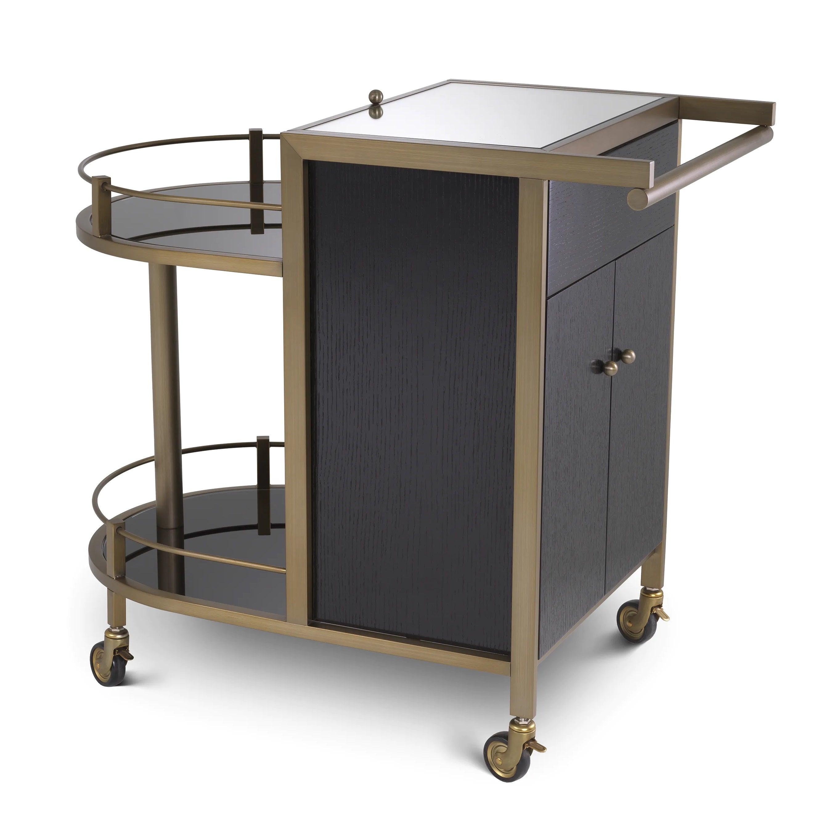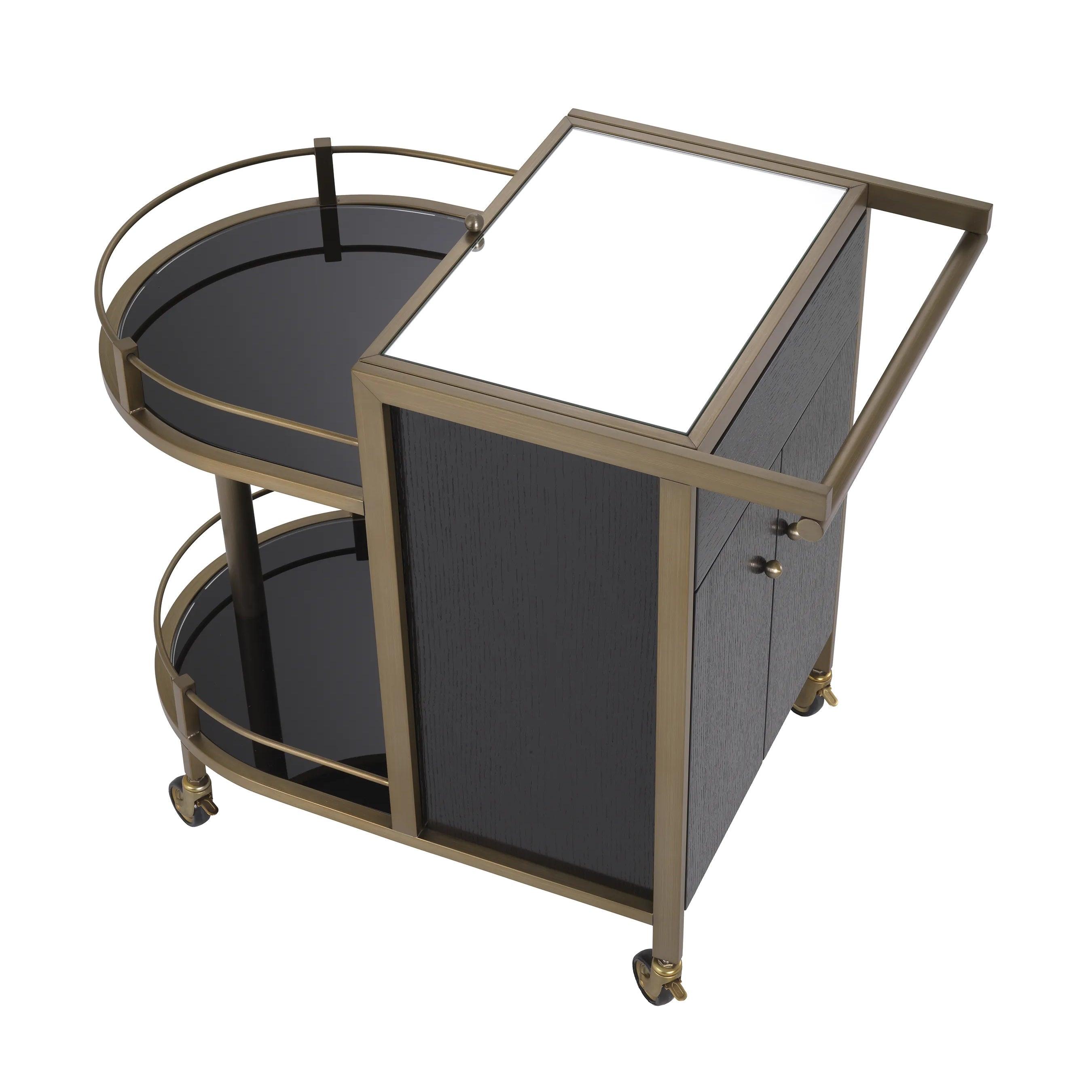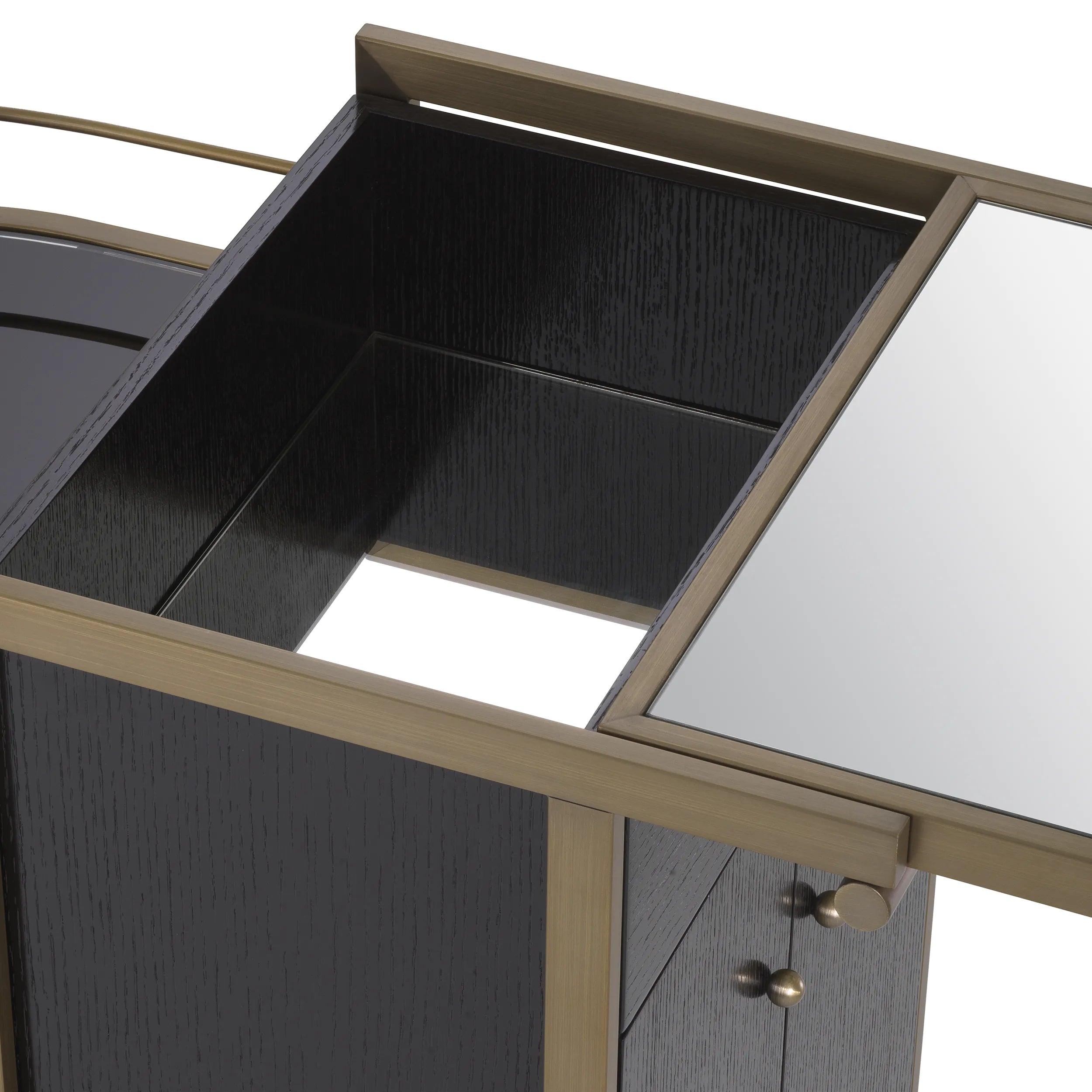 Auf den ersten Blick zeichnet sich der Barwagen durch sein minimalistisches und gleichzeitig raffiniertes Design aus. Das Furnier aus schwarzer Eiche, aus dem er gefertigt ist, schafft eine perfekte Harmonie mit Elementen aus gebürstetem Messing und verleiht dem Ganzen einen einzigartigen Charakter. Die umkehrbare, spiegelnde Glasplatte ist der ideale Ort zum Zubereiten und Servieren von Cocktails. Sie reflektiert das Licht und verleiht jedem Getränk und den Zutaten, die Sie darauf platzieren, einen besonderen Glanz. Zwei halbrunde Regale präsentieren perfekt Gläser und Barzubehör und betonen deren Schönheit und Eleganz. Darüber hinaus bietet der Schrank, der von vorne durch stilvolle Türen zugänglich ist, Platz für die Gegenstände, die Sie nur für sich behalten möchten. Es ist der ideale Ort für teurere Spirituosen oder spezielle Zubehörteile zum Servieren.