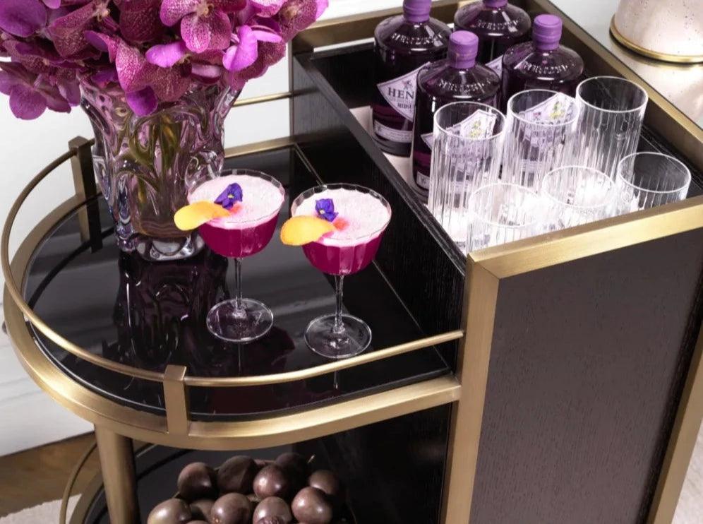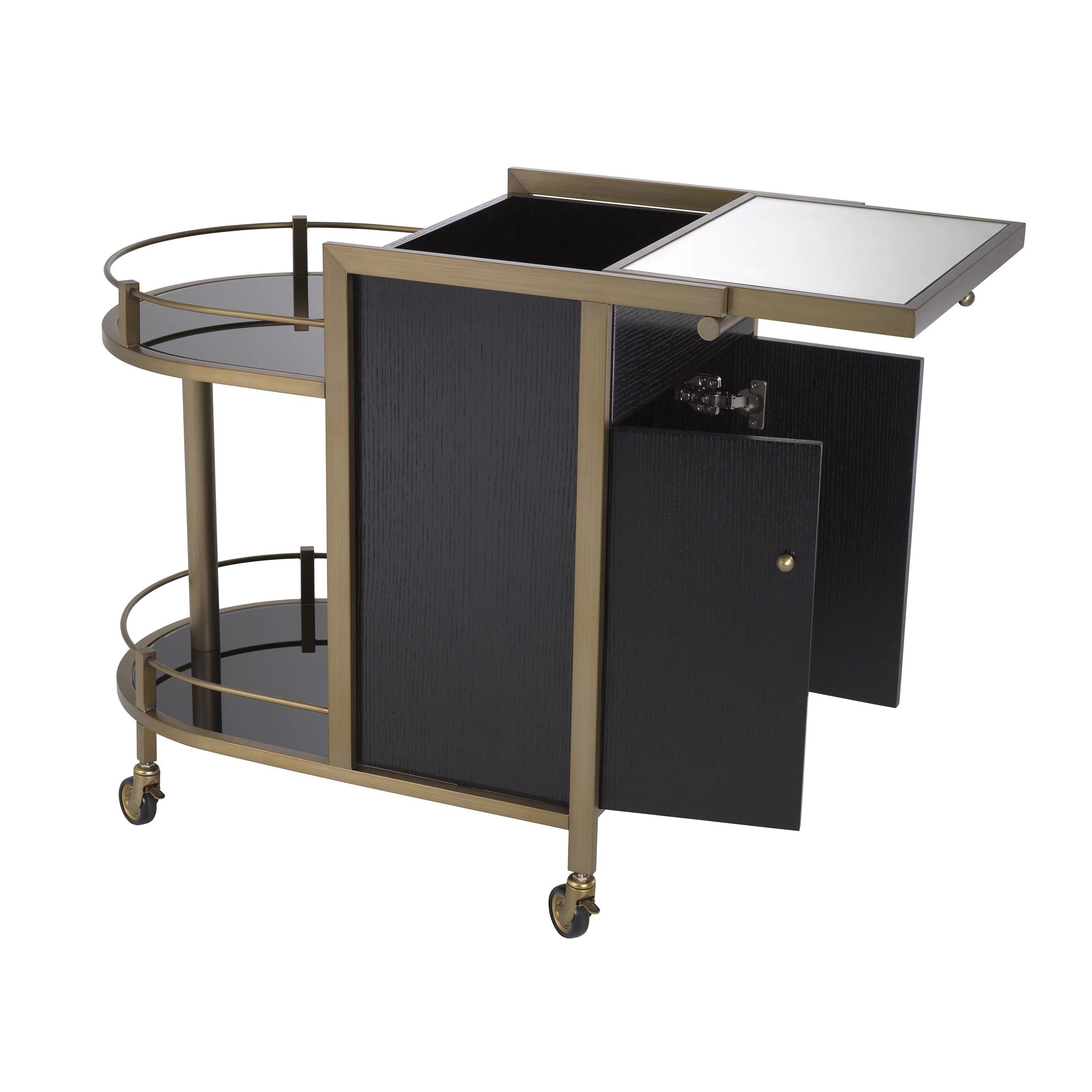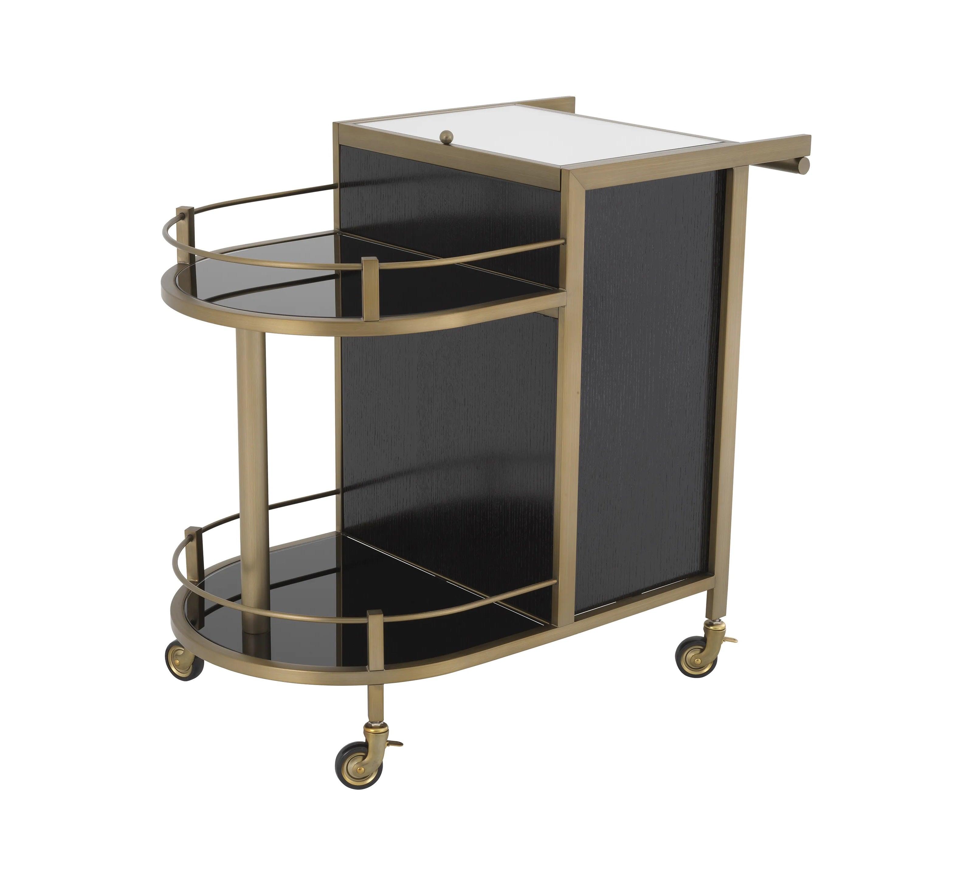 Auf den ersten Blick zeichnet sich der Barwagen durch sein minimalistisches und gleichzeitig raffiniertes Design aus. Das Furnier aus schwarzer Eiche, aus dem er gefertigt ist, schafft eine perfekte Harmonie mit Elementen aus gebürstetem Messing und verleiht dem Ganzen einen einzigartigen Charakter. Die umkehrbare, spiegelnde Glasplatte ist der ideale Ort zum Zubereiten und Servieren von Cocktails. Sie reflektiert das Licht und verleiht jedem Getränk und den Zutaten, die Sie darauf platzieren, einen besonderen Glanz. Zwei halbrunde Regale präsentieren perfekt Gläser und Barzubehör und betonen deren Schönheit und Eleganz. Darüber hinaus bietet der Schrank, der von vorne durch stilvolle Türen zugänglich ist, Platz für die Gegenstände, die Sie nur für sich behalten möchten. Es ist der ideale Ort für teurere Spirituosen oder spezielle Zubehörteile zum Servieren.