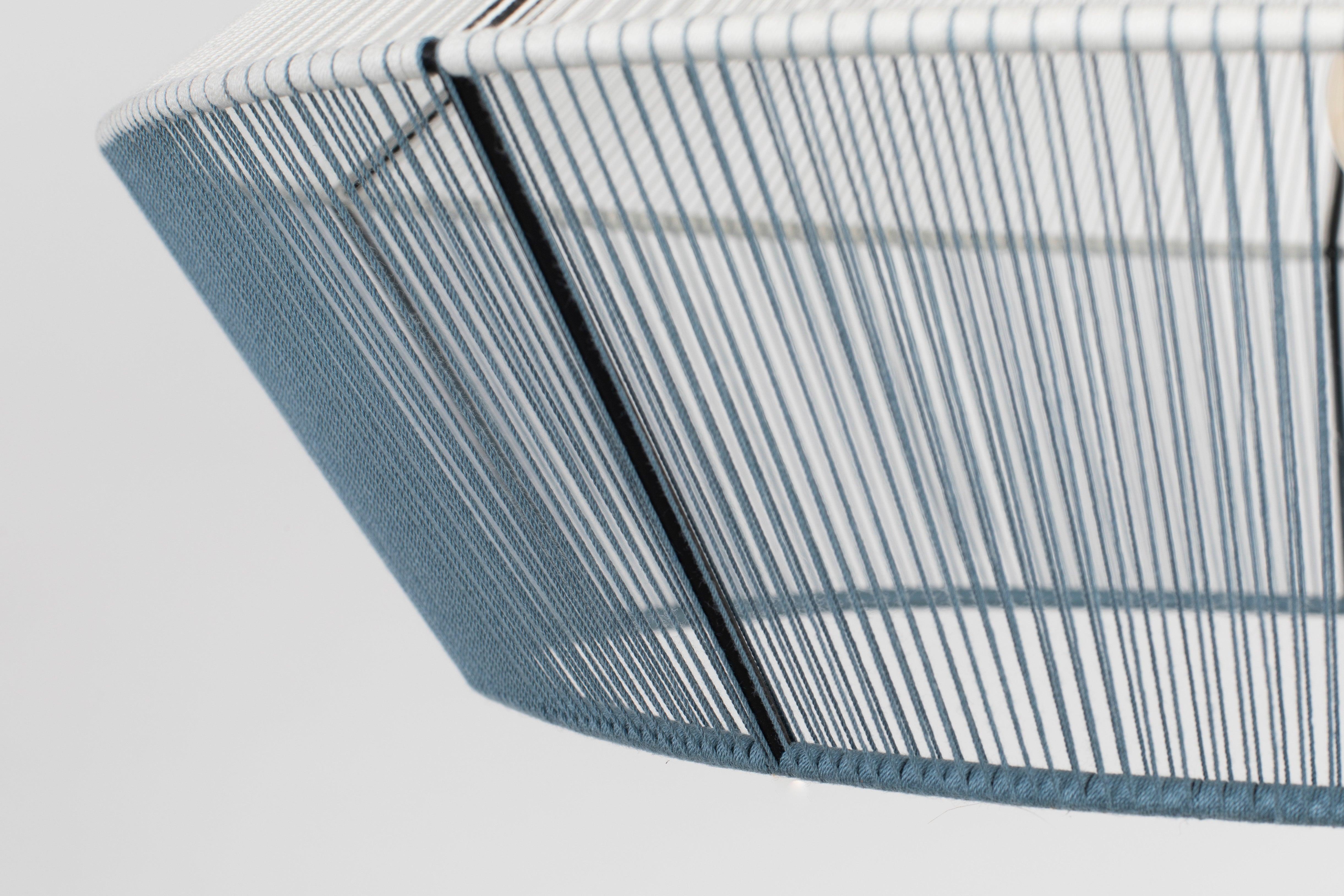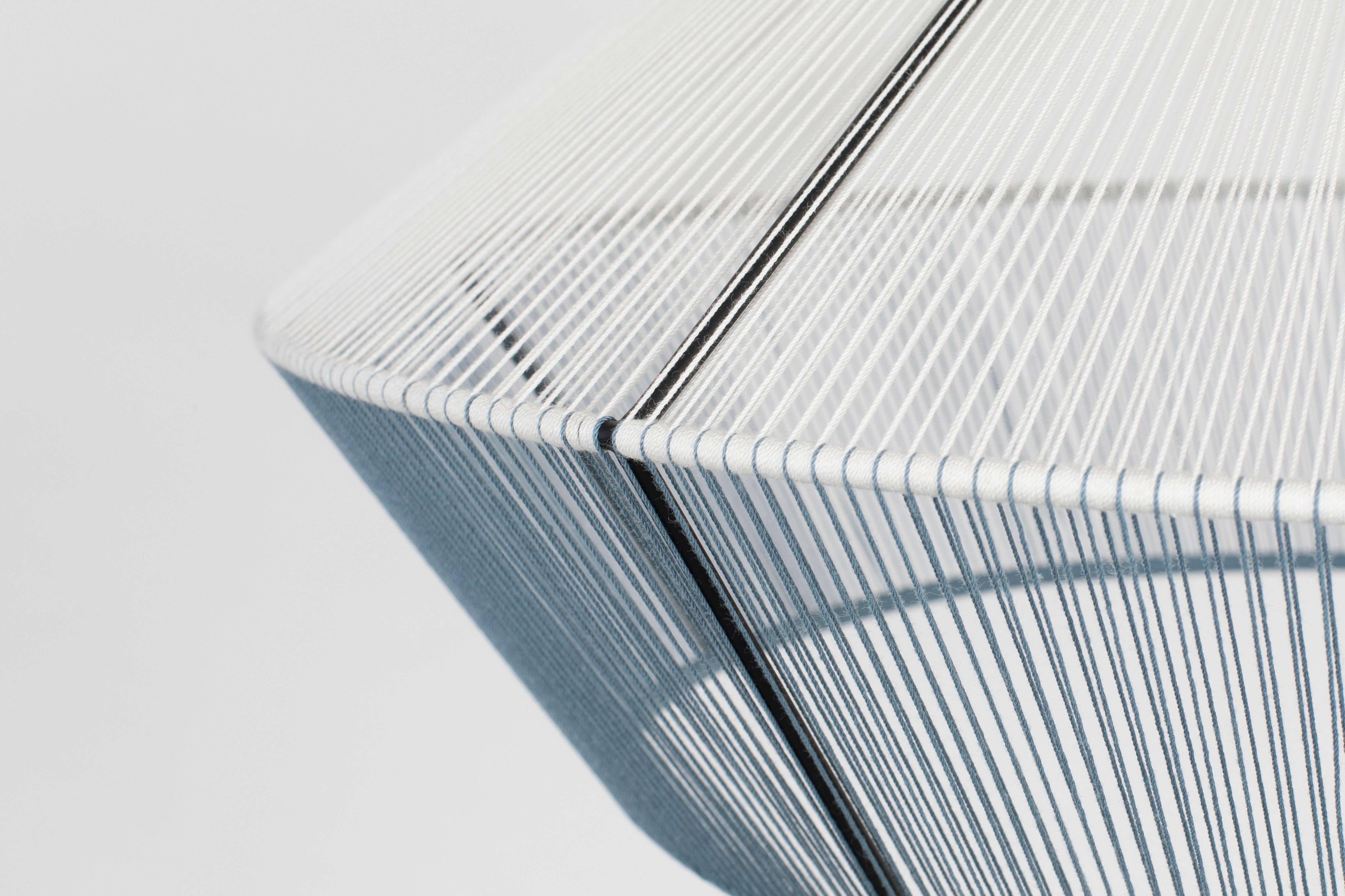 Dünne Baumwollfäden umgeben einen Metallrahmen und erzeugen einen hellen Nebel um den strahlenden Kern. Die Wicklungstechnik und genau gewebte Fäden sorgen für die Schwerelosigkeit der Bindung. Das Lampe, die eine verträumte, märchenhafte Stimmung verursacht, erfüllt den Raum mit einem magischen Glanz.