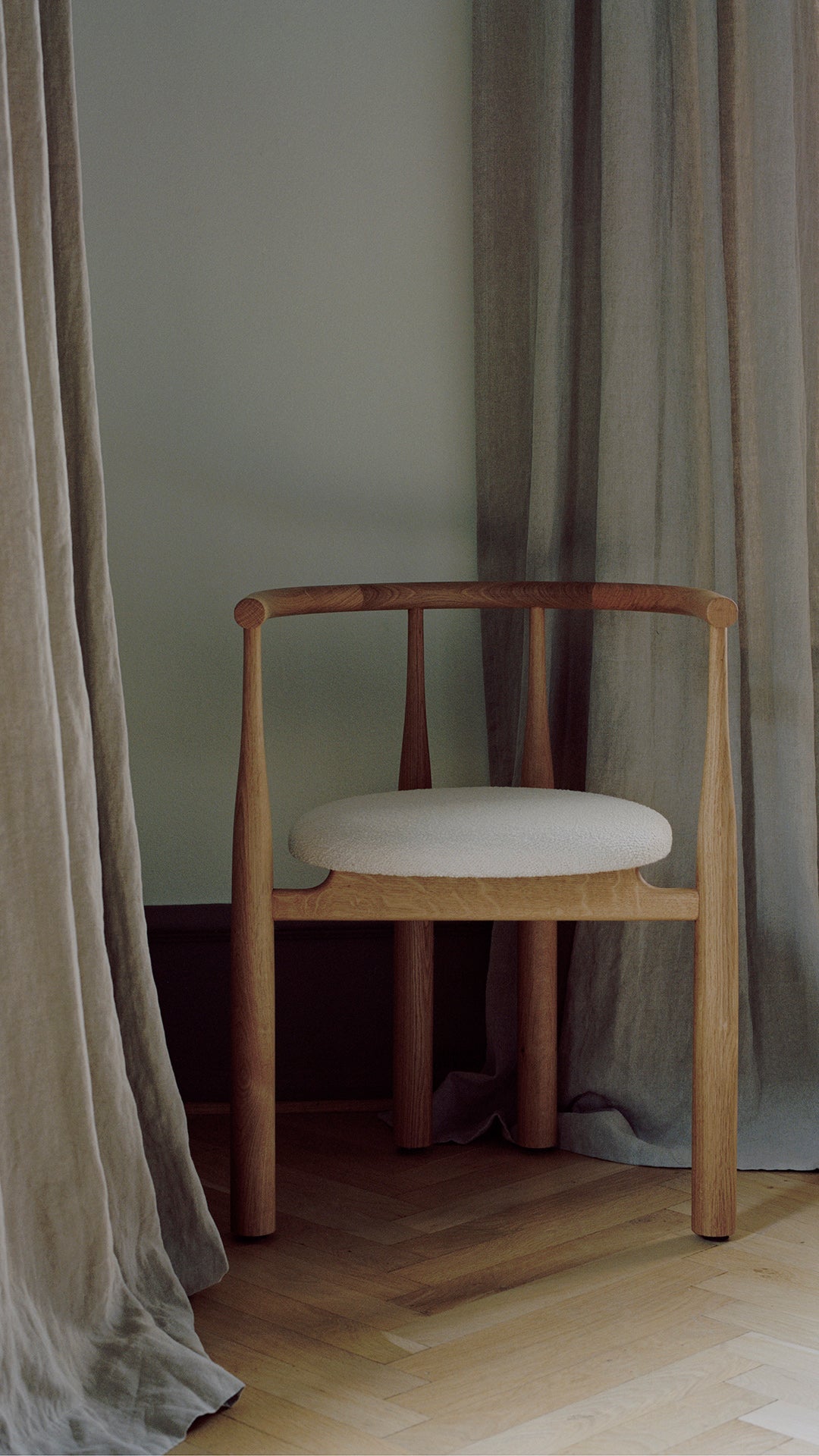 Die einzigartig profilierten Stuhlbeine verbinden die Schlankheit mit Solidität und schaffen ein harmonisches Verhältnisspiel, das einem flüssigen Tanz aus Material ähnelt. Wenn Sie das Gewicht der Struktur nach unten verschieben, wird ihr Stabilität und monumentales Erscheinungsbild vermittelt und gleichzeitig ein subtiles visuelles Licht beibehalten.