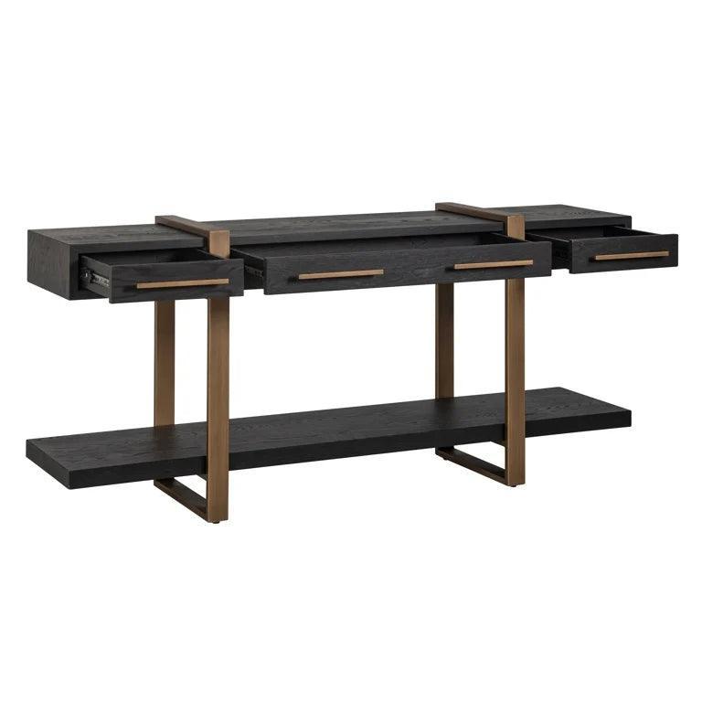 Konsole Cambon strahlt Stil und Klasse aus. Die Leistung basiert auf Oakfurnier und subtilen Messingakzenten, die diesen einzigartigen Möbeln einen Charme verleihen. Zusätzlich zu ihrem ästhetischen Erscheinungsbild unterscheidet sich die Cambon -Konsole auch durch hohe Funktionalität dank drei geräumiger Schubladen, die viel Stauraum bieten.