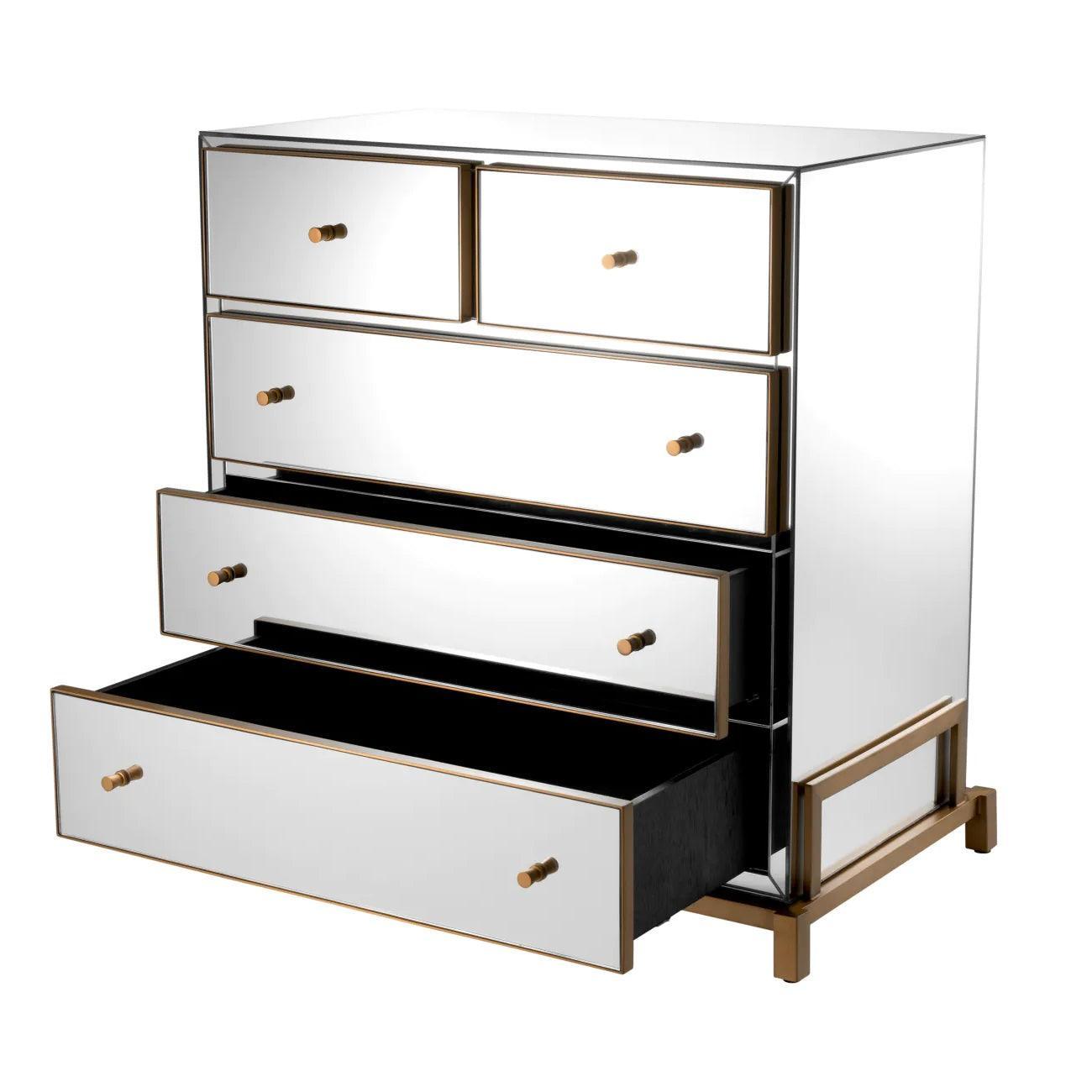Kommode Clarington ist ein echtes Juwel in der Welt der Möbel. Seine Spiegelflächen reflektieren Licht, öffnen den Raum und verleihen dem gesamten Raum Leichtigkeit. Es ist nicht nur ein Möbel für die Lagerung, sondern auch ein dekoratives Element, das das Innenraum beleuchtet und verbessert. Base Designer -Kommode Bei vier Beinen gibt es ihm Leichtigkeit und Delikatesse, und das Finish von gebürstetem Messing betont die Eleganz. Die Knöpfe im gleichen Finish fügen Adel hinzu und ergänzen das Ganze, wodurch mit einer Spiegeloberfläche eine harmonische Wirkung erzielt wird.