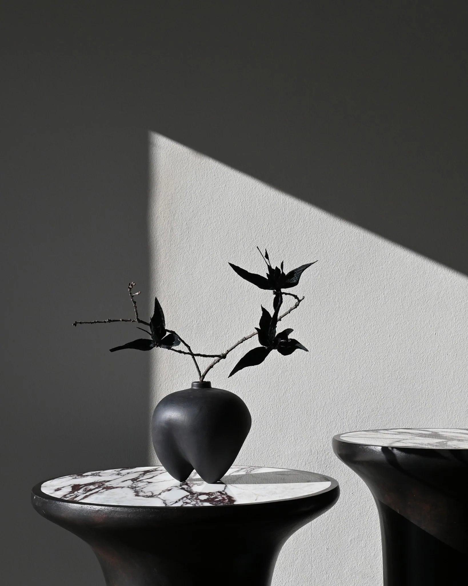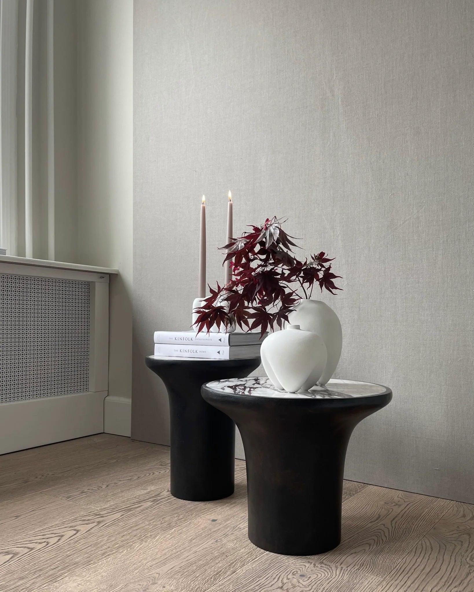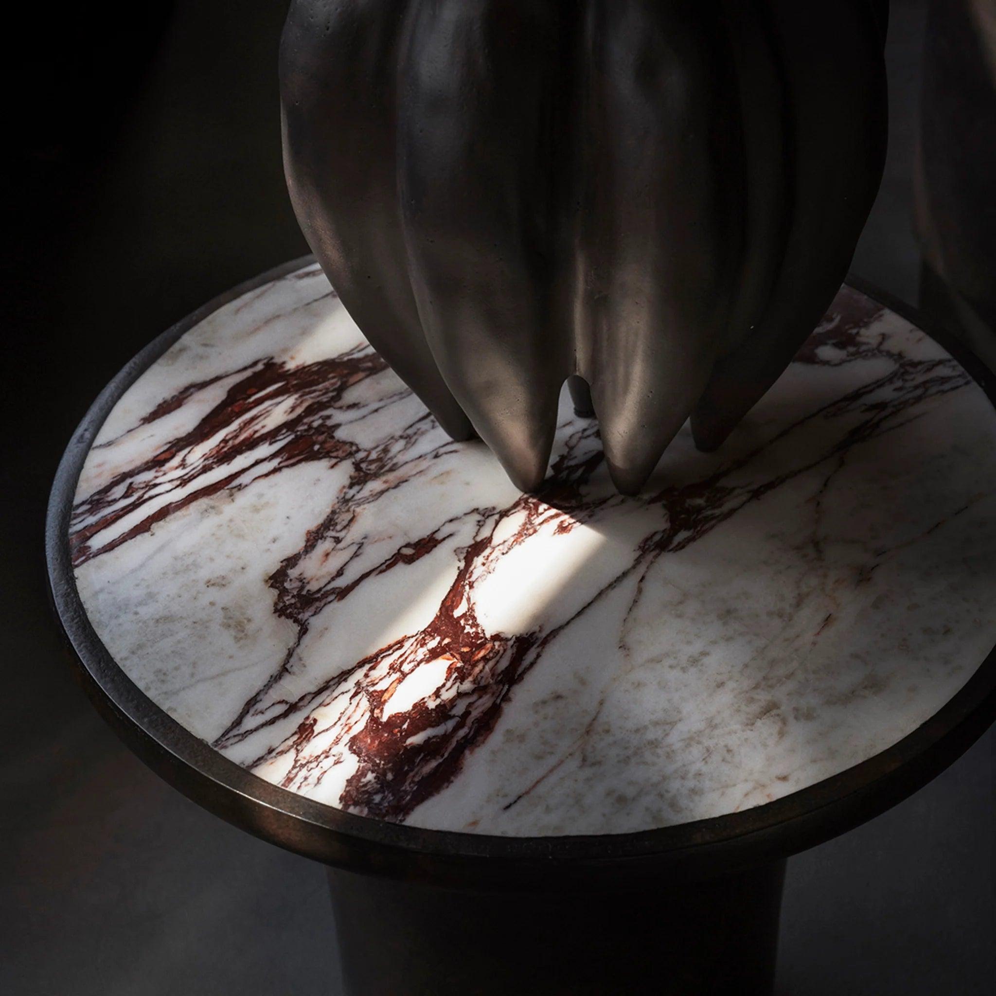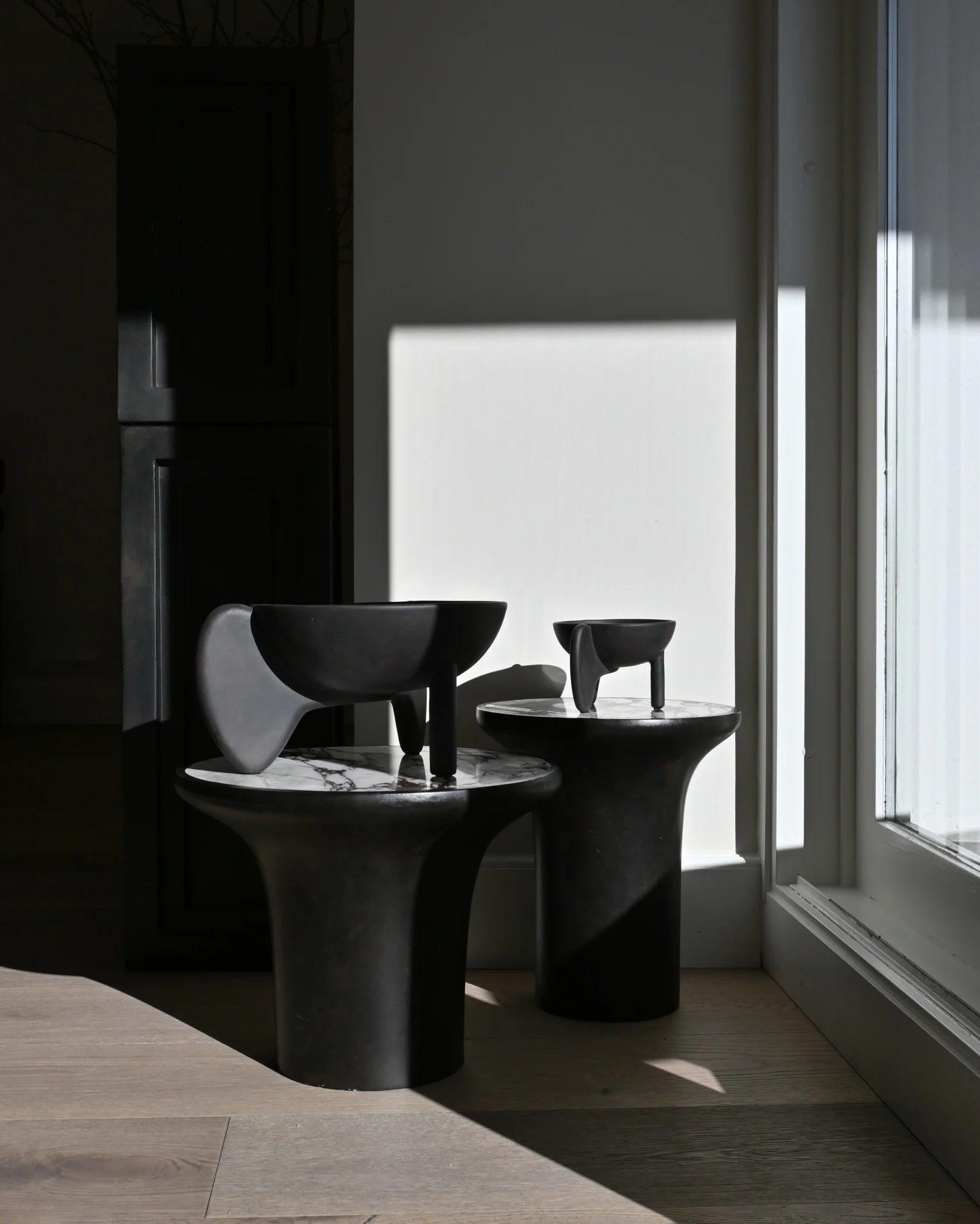 Tische sind in zwei Varianten erhältlich, eine mit Fliesen in Calacatta-Farbe und die andere Variante besteht aus drei Arten von exquisitem Marmor, wobei alle Fliesen in einem Tischrahmen aus Faserbeton montiert sind. Jeder Tisch ist aufgrund der natürlichen Unterschiede in Farbe und Muster jedes Marmors einzigartig.