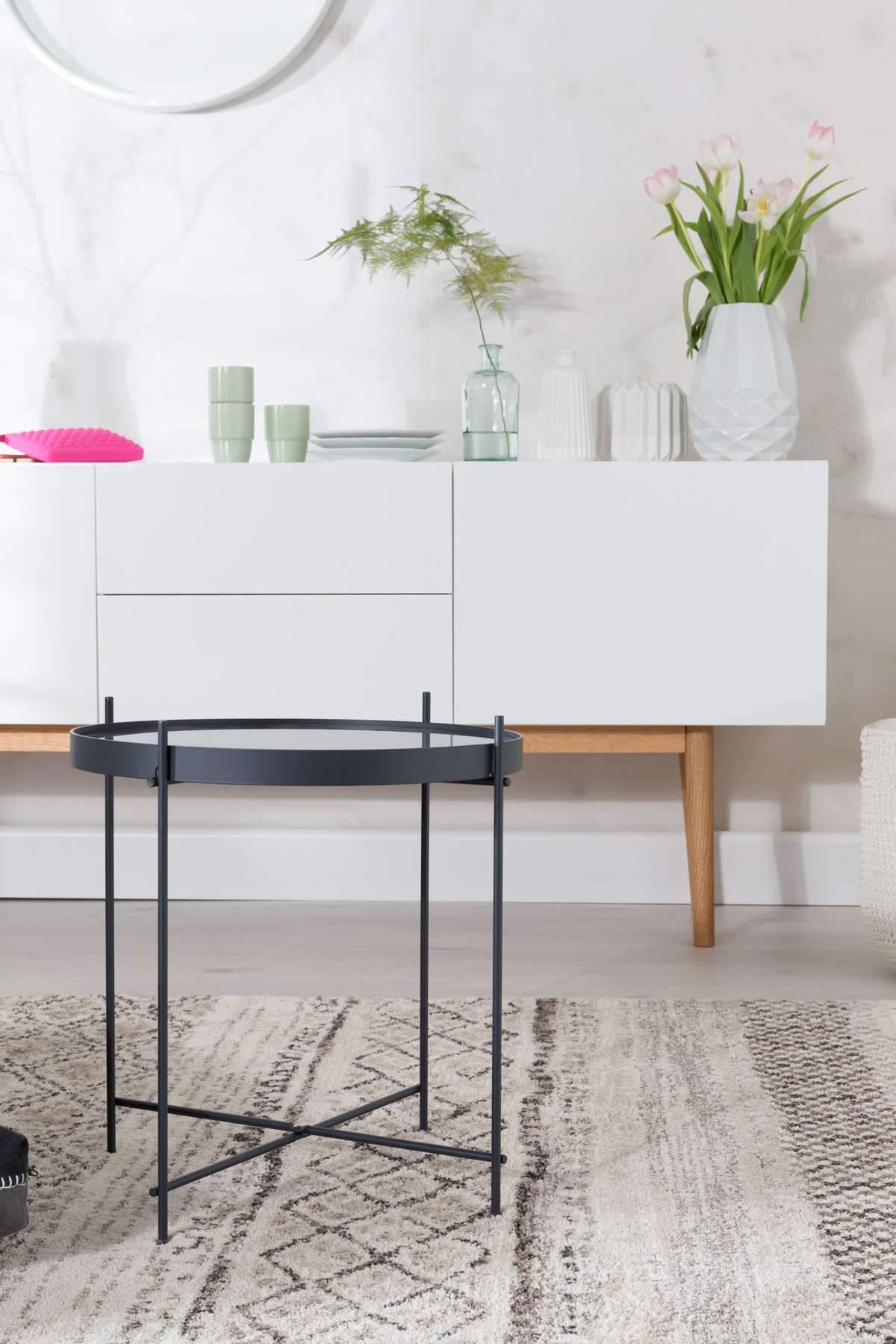 Der schwarze, metallische Rahmen, der mit einer Pulverbeschichtung in Schwarz versehen wurde, trägt die Glas platte. Das Gesamtbild verleiht jedem Raum Eleganz.