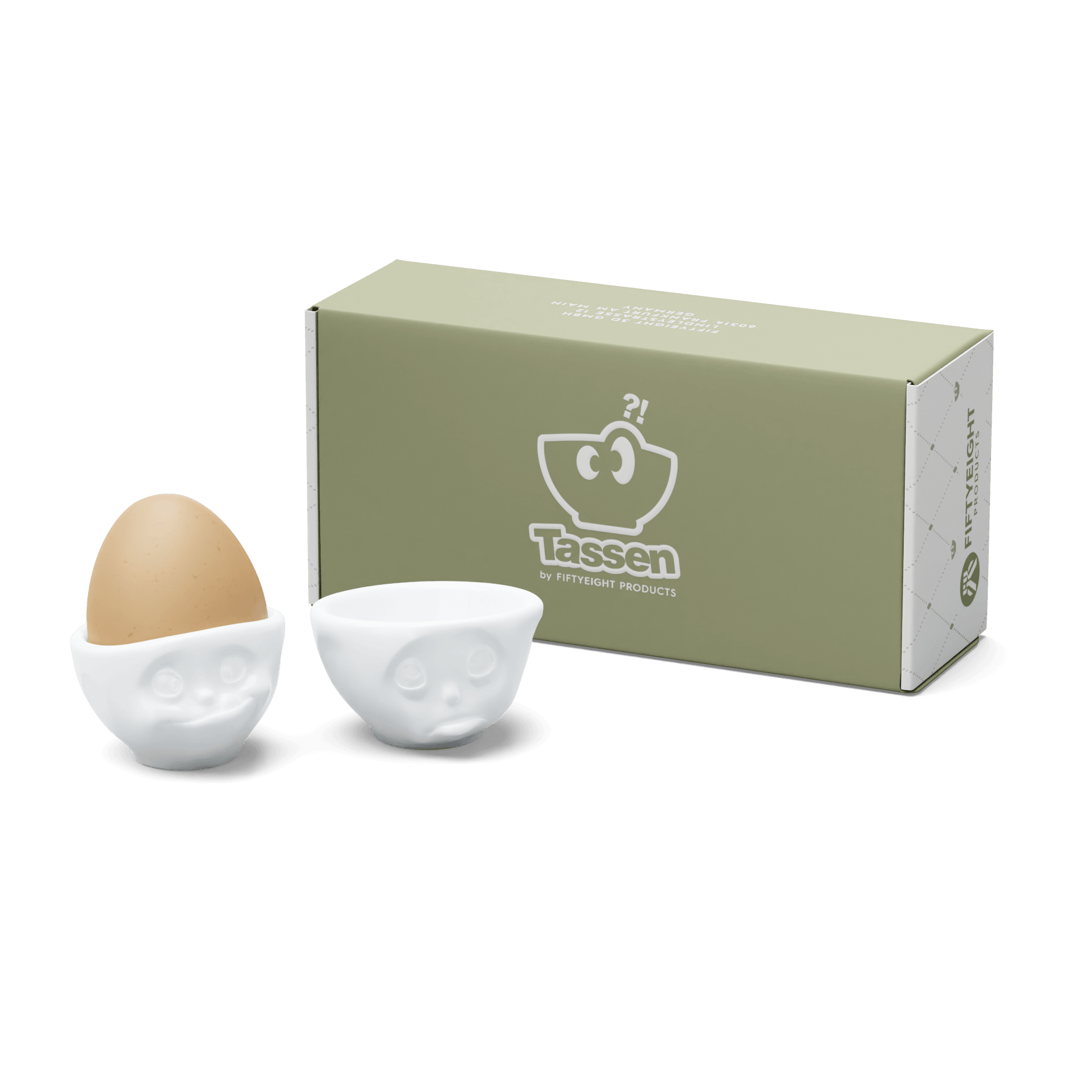 Ei steht Oh bitte und lecker in White ist ein charmantes Zwei -Stück -Set, das jedem Tisch Charme verleiht. Diese Eierständer haben klare Gesichter: Einer drückt eine Anfrage aus und der andere zeigt einen Hungeransatz.