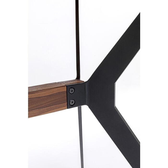 Essenstisch mit einem designerischen Flair. Die Oberfläche der Tischplatte aus massivem Holz zeichnet sich durch eine charakteristische, natürliche Anordnung der Holzmaserung aus. Der Lack verleiht der eleganten Oberfläche eine schützende Schicht. Die dynamisch geformte Basis aus schwarzem Stahl verleiht diesem Esstisch Dynamik und Leichtigkeit. Als stilvolles Detail harmoniert der zentrale Holzträger des Rahmens mit der Tischplatte.