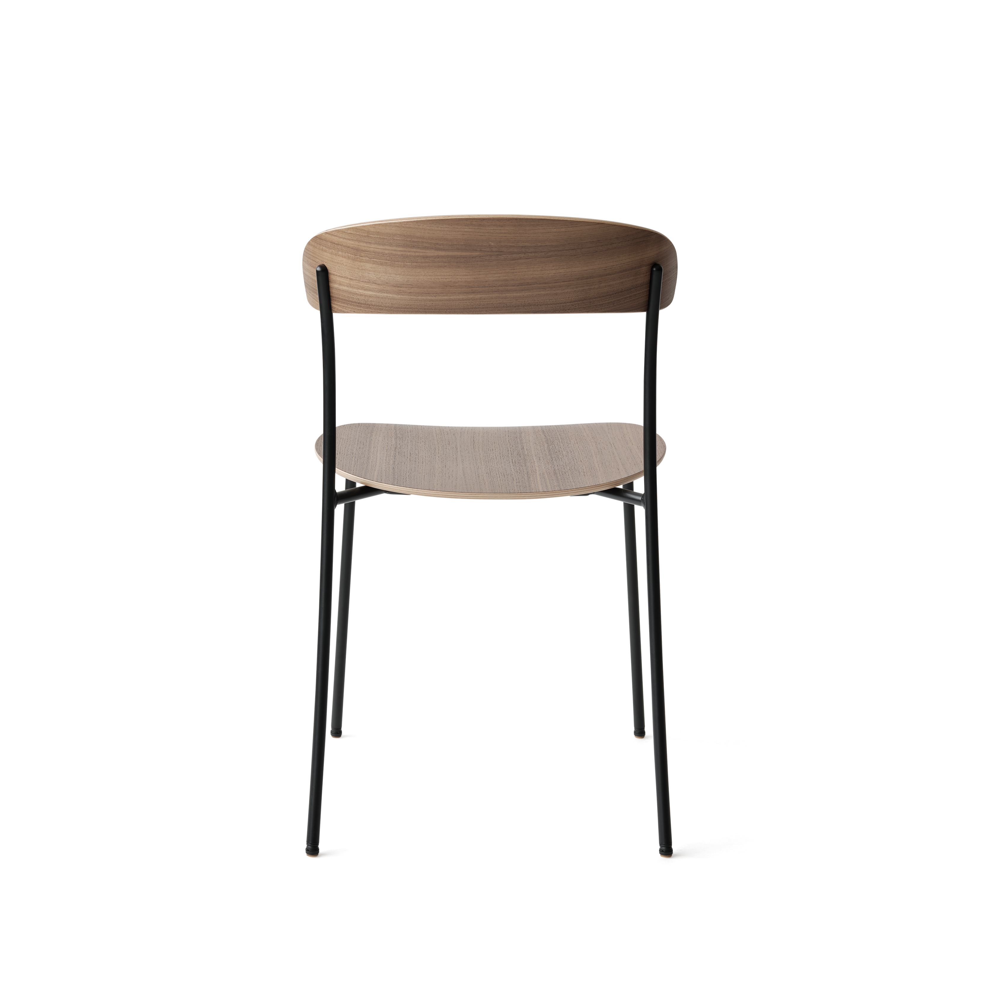 Der mit Nussfurnier bedeckte Sitz und die Stütze verleihen den Möbeln ein warmes, natürliches Erscheinungsbild und betonen die Eleganz von Holz und sein einzigartiges Getreide. Dank der ergonomisch gestalteten Proportionen bietet der Stuhl eine bequeme Nutzung und funktioniert sowohl im Speisesaal als auch in Gewerbeflächen wie Restaurants oder Cafés gut.