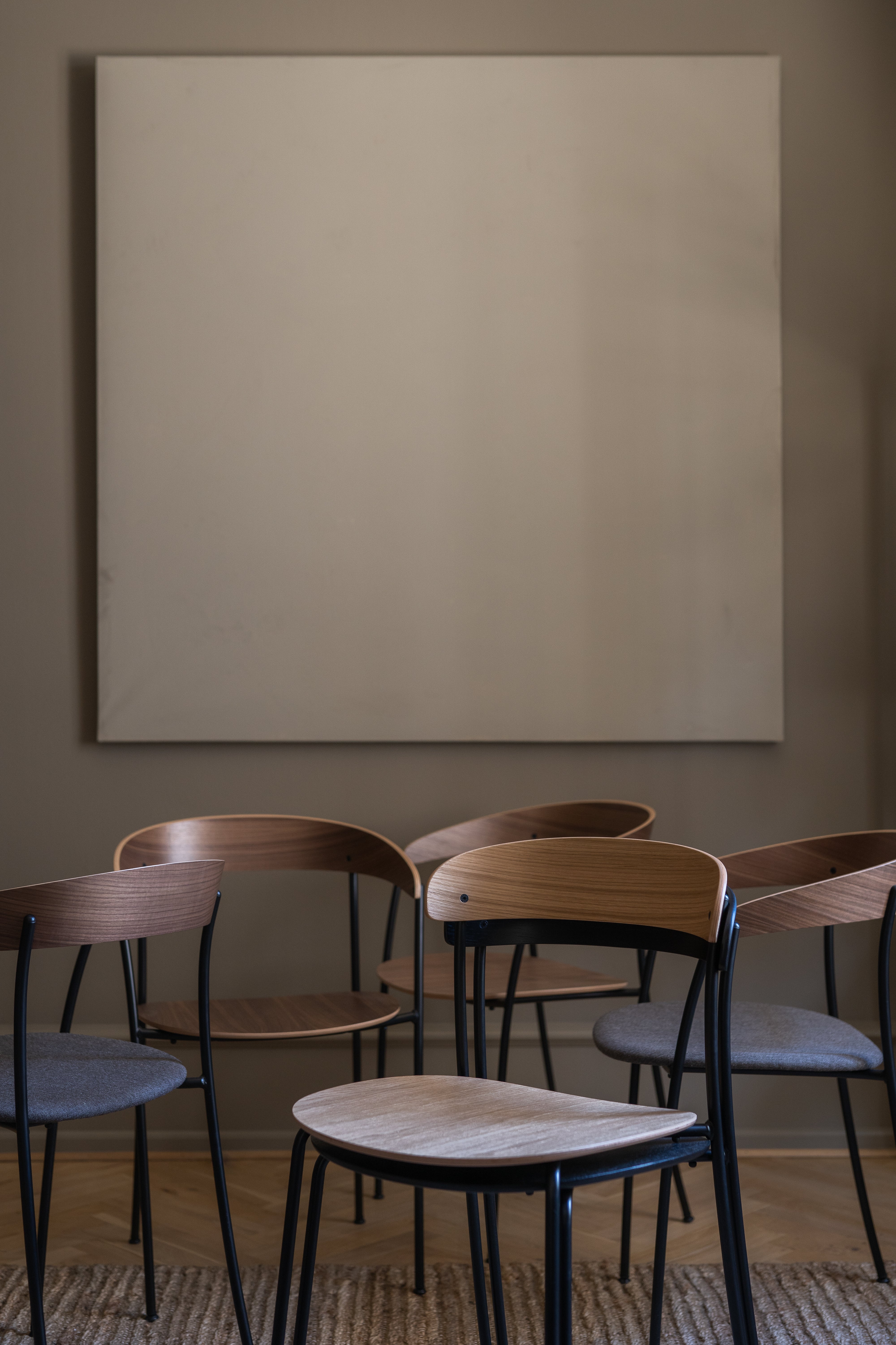 Stuhl Das Fehlen ist eine minimalistische Interpretation einer klassischen Form, die die visuelle Leichtigkeit mit solider Leistung kombiniert. Seine zarten Linien und ein schlanker Stahlrahmen verleihen ihm einen subtilen, fast zeichnischen Charakter und gewährleisten die Haltbarkeit und Stabilität.