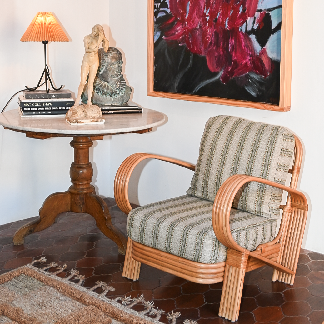 Fotel Bamboo Green ist eine außergewöhnliche Kombination aus natürlichen Materialien und elegantem Vintage-Design. Die handgefertigte Konstruktion aus gebeiztem Bambus begeistert durch Leichtigkeit und exotischen Charakter, während die weichen Sitz- und Rückenkissen, bezogen mit gestreifter Stoff in Grüntönen, dem Raum eine subtile Frische verleihen. Es ist ein Möbelstück, das Komfort mit einzigartärem Ästhetik verbindet und eine freundliche und gemütliche Atmosphäre schafft.