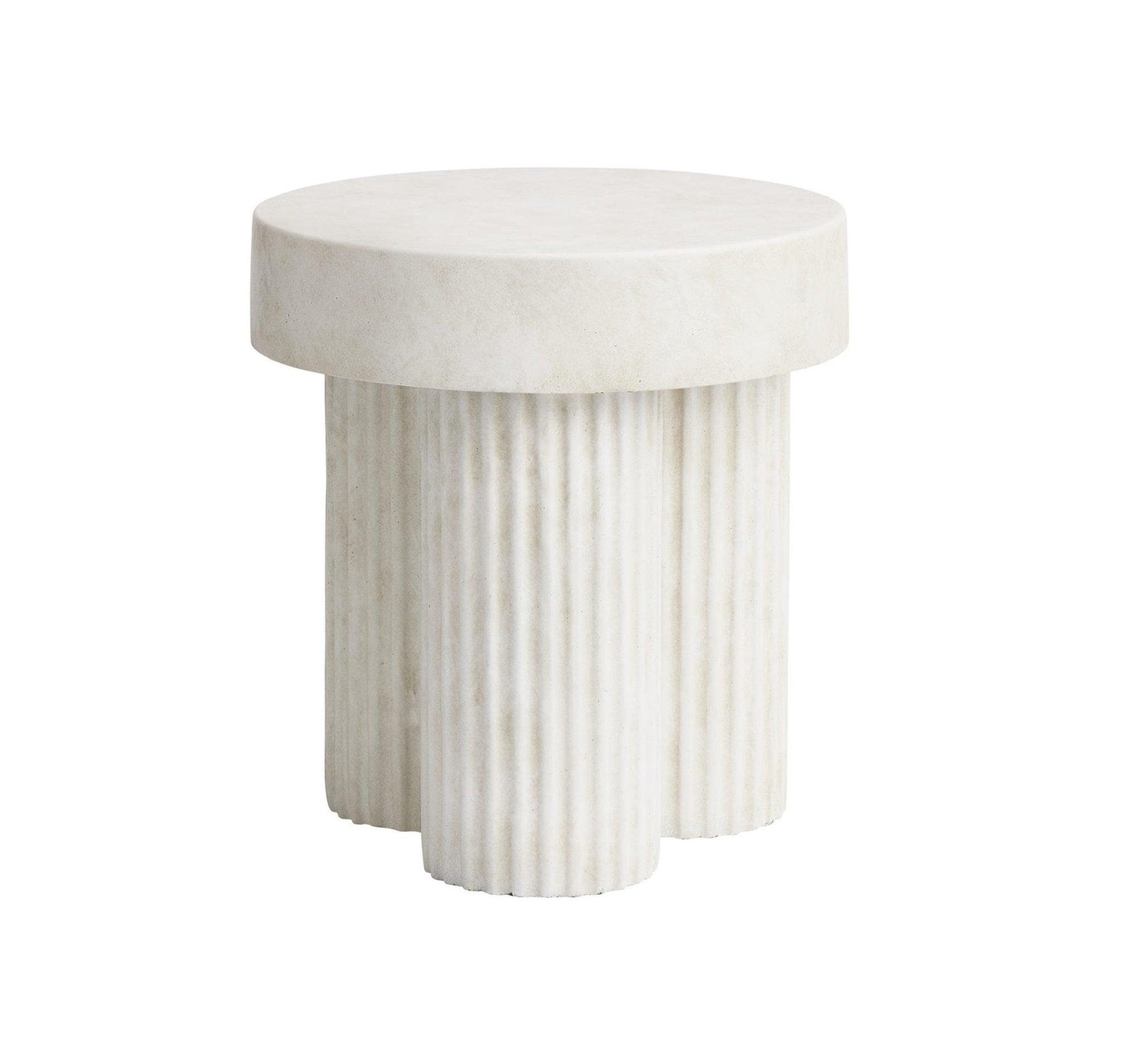 Ausrüstung ist von der Architektur des Brutismus ab Mitte des 20. Jahrhunderts inspiriert. Skulptural Tische Kaffee und Seiten wurden als Konstruktionen konzipiert, die an Blöcke erinnern und die architektonischen Elemente des Betongebäudes widerspiegeln. Tische Die Ausrüstung ist mit einem runden Oberteil ausgestattet und ruht auf drei Zylinderbeinen.