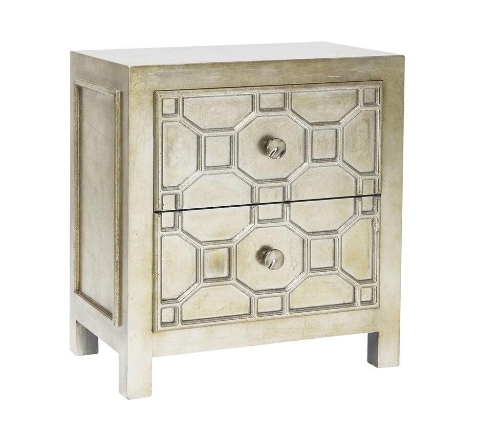 Die Alhambra-Kommode ist eine Hommage an die Ornamentik und Details, die von der arabischen Kunst inspiriert sind. Ihre Vorderseite zeichnet sich durch filigrane Muster aus, die durch ein exklusives, mattes Finish in Silber hervorgehoben werden, was ihr Eleganz und ein luxuriöses Aussehen verleiht, das perfekt zum Glamour-Stil passt.