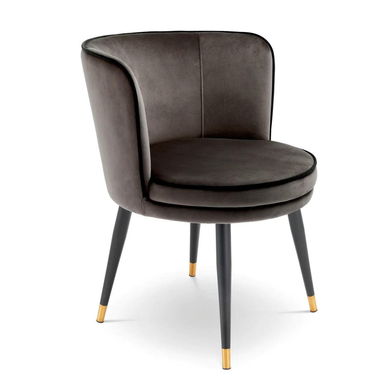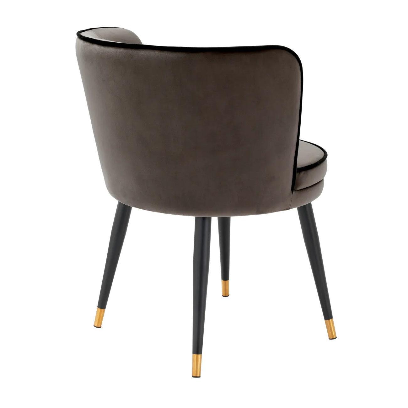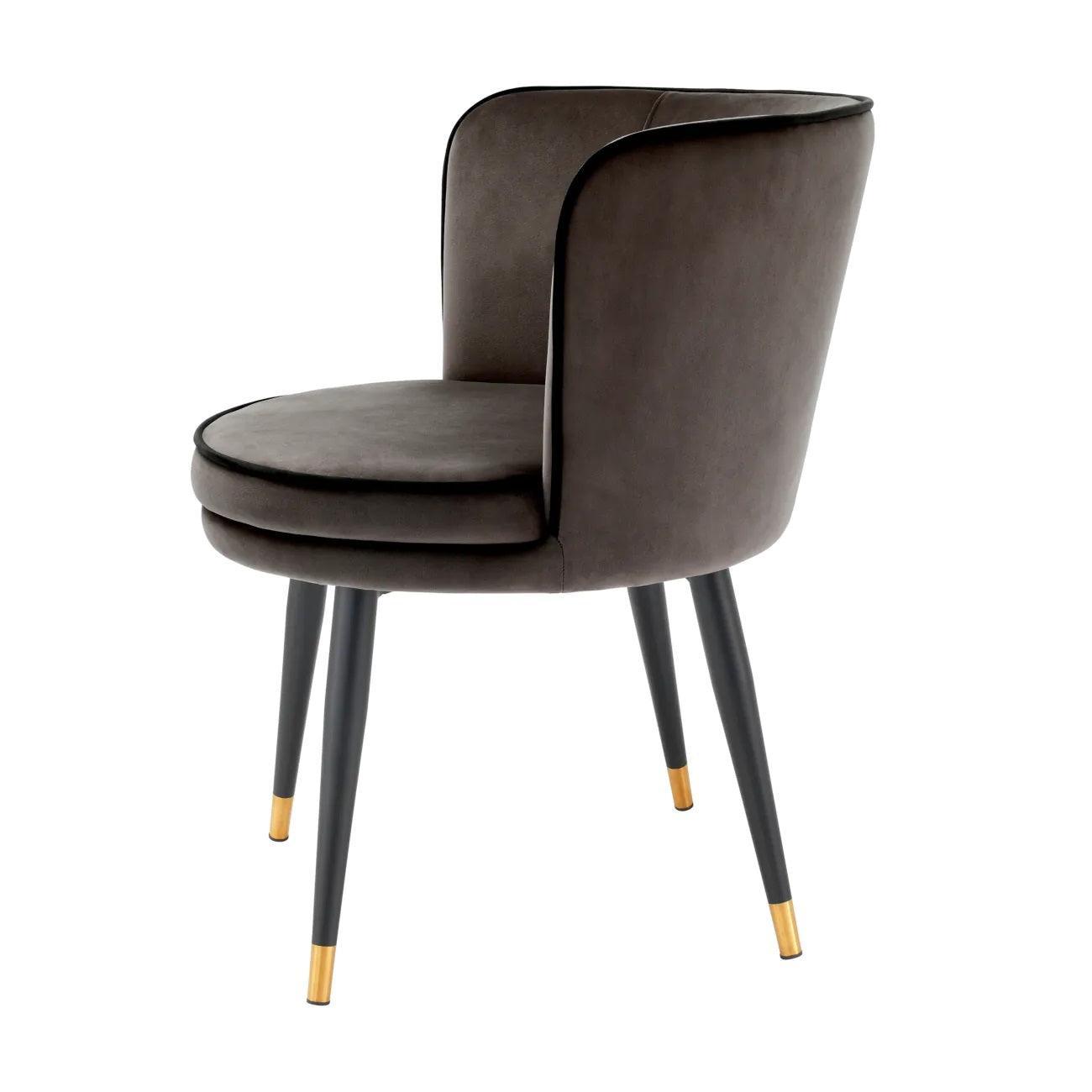 Eines der ersten Elemente, die ins Auge fallen, sind seine schwarzen konischen Beine. Diese subtile Anspielung auf klassisches Design verleiht dem gesamten Stuhl Eleganz. Darüber hinaus sind die Beine mit goldenen Auflagen verziert, die ihnen einen besonderen Glanz und eine luxuriöse Ausführung verleihen. Dieser Stuhl wird mit Sicherheit die Aufmerksamkeit jedes Gastes auf sich ziehen.