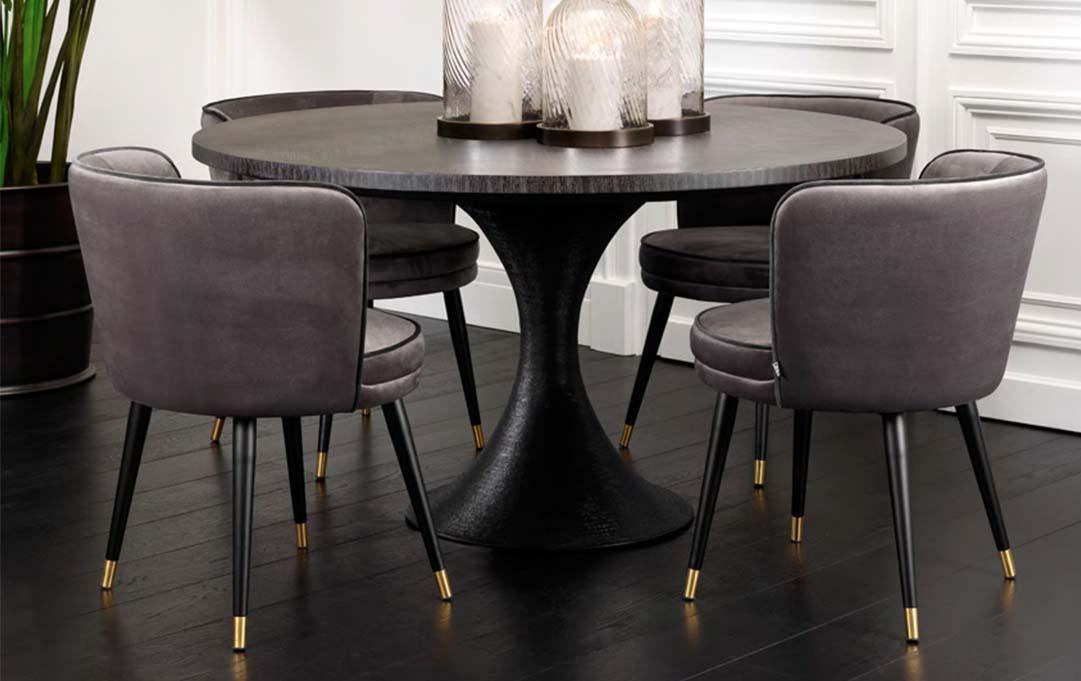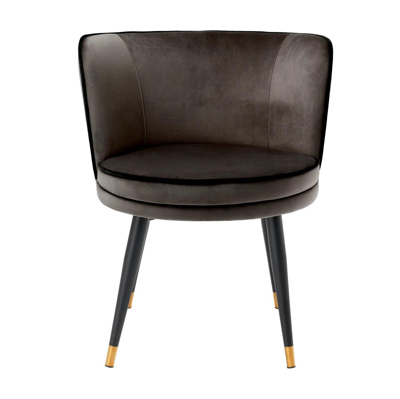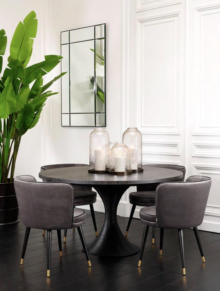 Eines der ersten Elemente, die ins Auge fallen, sind seine schwarzen konischen Beine. Diese subtile Anspielung auf klassisches Design verleiht dem gesamten Stuhl Eleganz. Darüber hinaus sind die Beine mit goldenen Auflagen verziert, die ihnen einen besonderen Glanz und eine luxuriöse Ausführung verleihen. Dieser Stuhl wird mit Sicherheit die Aufmerksamkeit jedes Gastes auf sich ziehen.
