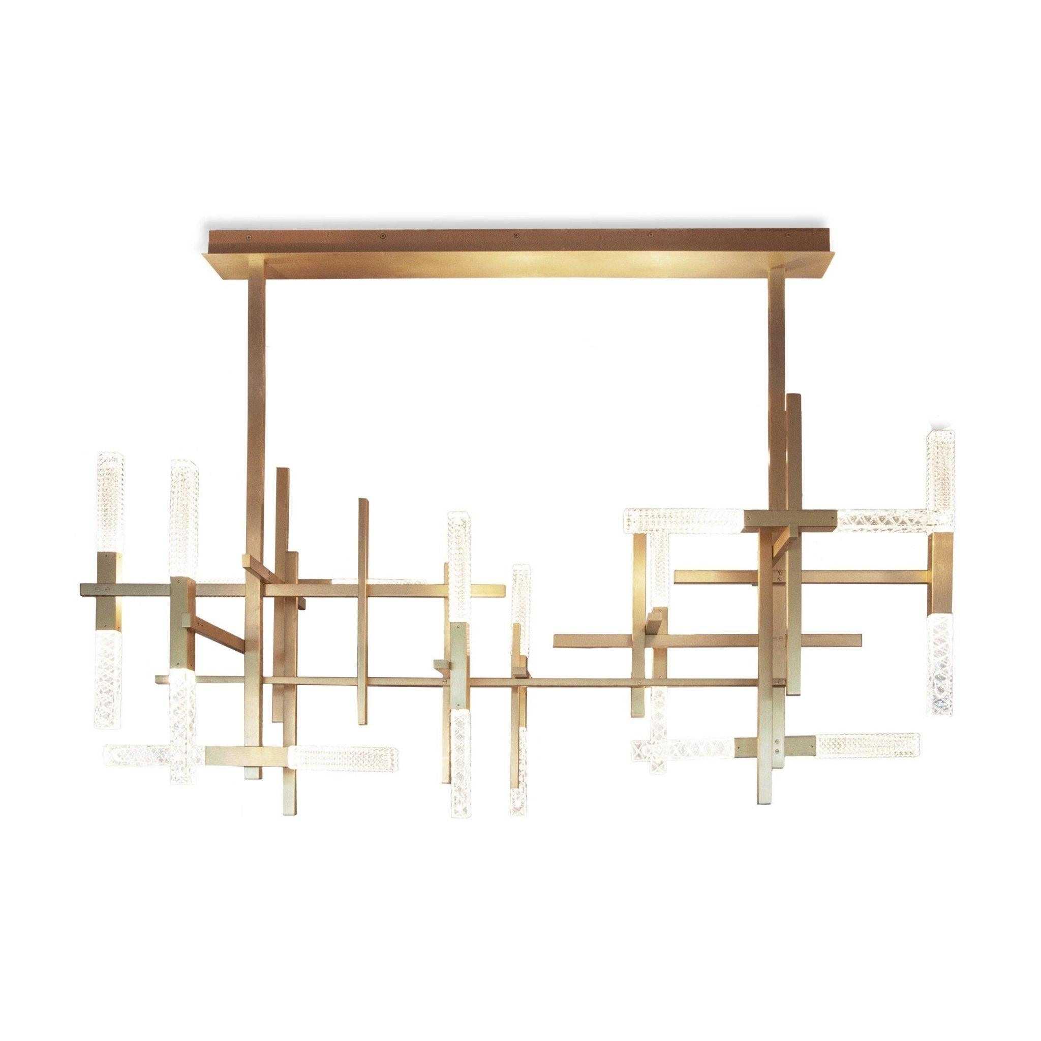 Die Kombination aus rechteckigen Messingrohren und schrägen Würfeln aus graviertem Kristall verleiht der hängenden Lampe Mikado Double einen Hauch von Stil.