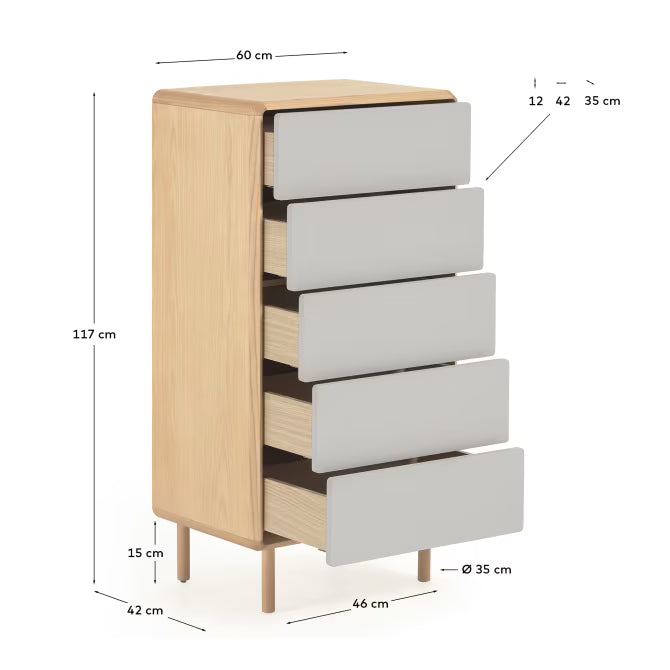 Die Anielle Kommode ist ein elegantes und zeitloses Möbelstück, das die natürliche Wärme von Eschenholz mit einem modernen, grau-weißen Finish der lackierten Fronten verbindet. Ihre sanften, abgerundeten Linien und harmonische Form verleihen dem Raum Ruhe und subtile Leichtigkeit. Diese Holzkommode wurde so entworfen, dass sie den Komfort der täglichen Nutzung gewährleistet und gleichzeitig ein stilvolles dekoratives Element darstellt, das sich hervorragend in moderne, skandinavische und minimalistische Arrangements einfügt.