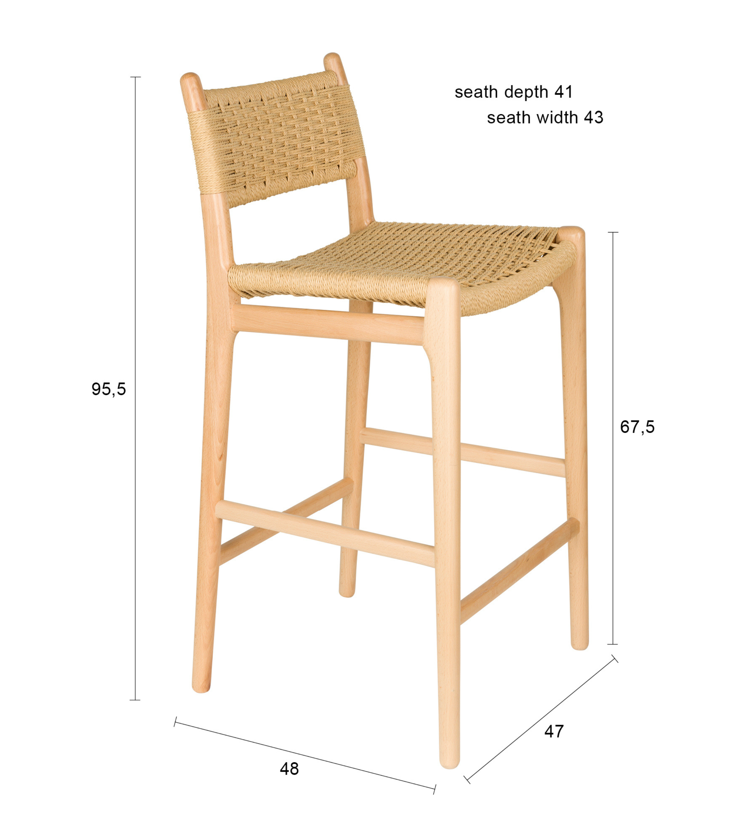 Hocker Cecile ist die Quintessenz von Leichtigkeit, natürlichen Materialien und kunsthandwerklicher Fertigung. Die hohe Sitzfläche aus geflochtenem Papierseil fügt sich perfekt in den hellen Rahmen aus Buchenholz ein. Dieses Modell eignet sich hervorragend für eine Kücheninsel, einen hohen Tisch oder eine Hausbar und bietet nicht nur Komfort, sondern auch einen einzigartigen Stil, inspiriert von skandinavischer und Japandi-Ästhetik.