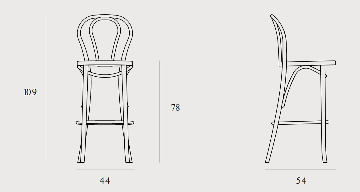 Das Modell Classic H-1840 stammt aus der Kollektion 1840, die eine Hommage an das Erbe der Marke Thonet-Mundus und die Revolution ist, die sie in der Welt der Bugholzmöbel bewirkt hat. Es ist eine ausgezeichnete Wahl für gewerbliche Räume – Bars, Cafés, Restaurants – sowie für private Küchen mit einer Kochinsel oder einer hohen Arbeitsplatte. Der Hocker vereint Prestige, Funktionalität und Respekt vor der Designgeschichte und bietet außergewöhnlichen Komfort und Ästhetik.