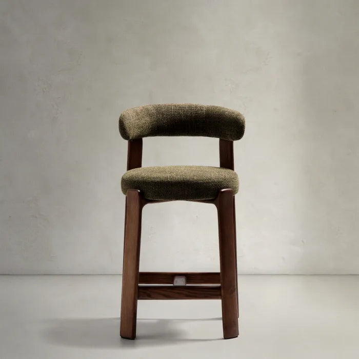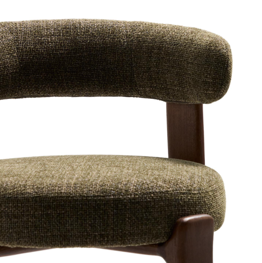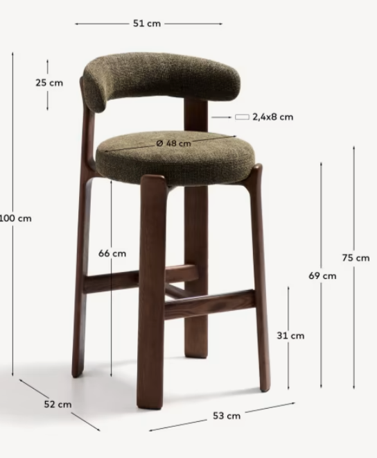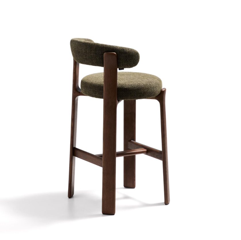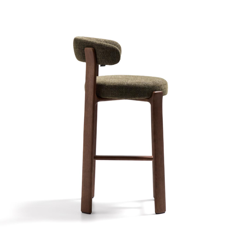 Der gepolsterte Sitz und die Rückenlehne sind mit weichem Chenille-Stoff bezogen, der einen effektvollen Kontrast zum Holz bildet. Das Material fühlt sich nicht nur angenehm an, sondern ist auch außergewöhnlich langlebig und umweltfreundlich – teilweise aus recycelten Fasern hergestellt. Das Ganze wurde auf Komfort ausgelegt – ein bequemer Sitz, eine gut profilierte Rückenlehne und die richtige Höhe machen Granite perfekt für eine Kücheninsel oder einen Stehtisch. Dieses Möbelstück sieht nicht nur schön aus, sondern verleiht dem Interieur auch Wärme, Leichtigkeit und stilvolle Ausgewogenheit. Perfekt für Liebhaber von gutem Design und natürlichen Materialien.