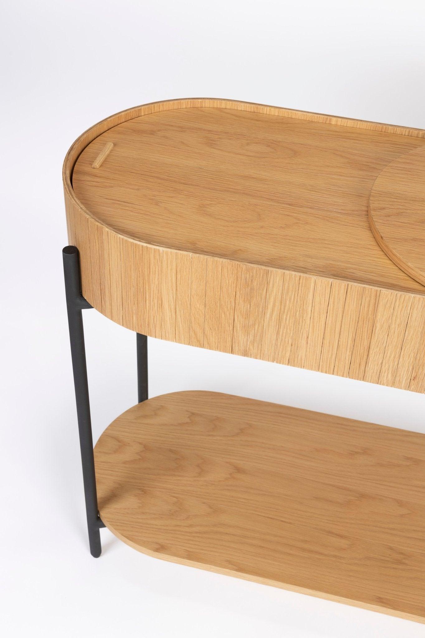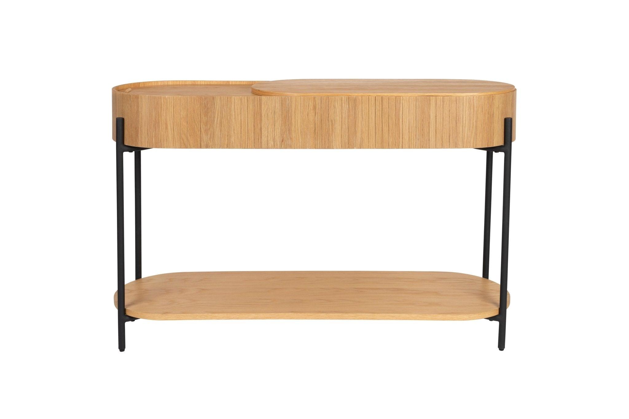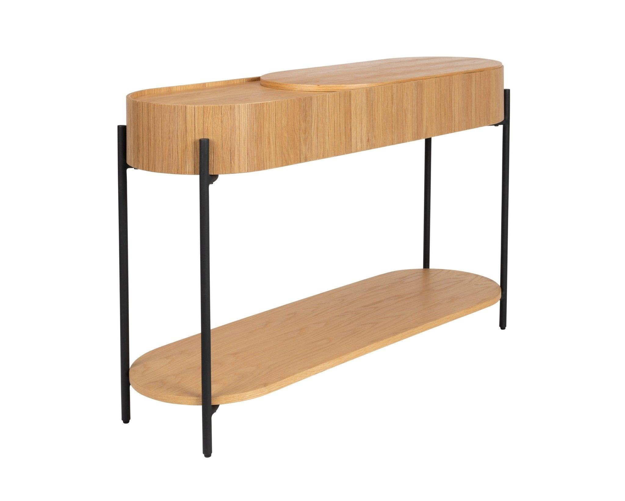 Verbessern Sie Ihren Wohnraum mit der eleganten und vielseitigen Kollektion Slides. Die Konsole Slides verfügt über eine durchdachte, verschiebbare Tischplatte. Wenn die Tischplatte verschoben wird, öffnet sich ein geräumiger, versteckter Stauraum. Mit außergewöhnlicher Liebe zum Detail verbindet die Konsole Eichenfurnier mit schwarzen, pulverbeschichteten Metallbeinen und schafft so eine harmonische Verbindung von natürlicher Schönheit und modernem Design.