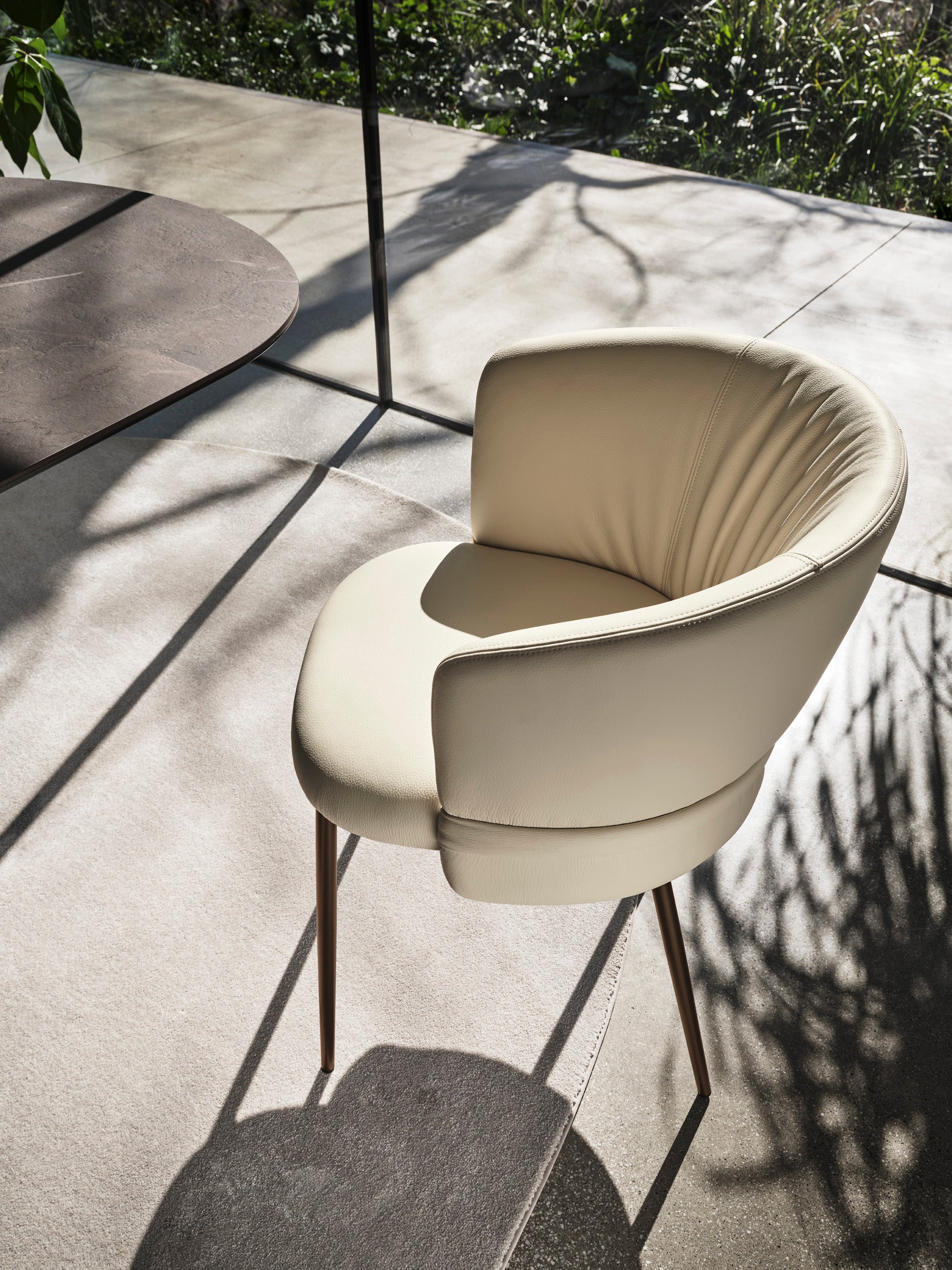 Ein charakteristisches Element des Stuhls Vanilla ist der geraffte Bezug sowie das horizontale Detail, das die Rückenlehne wie ein Gürtel umschließt und die raffinierte Ästhetik des Möbels unterstreicht. Sowohl die Version mit Holzbeinen als auch die mit Metallbeinen betont seine subtile Eleganz und macht den Stuhl zu einer stilvollen Wahl für das Esszimmer, das Wohnzimmer oder repräsentative Räume.