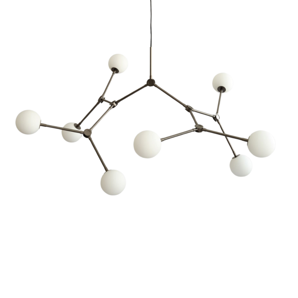 Drop Bulp ist eine elegante Verbindung von modernem Minimalismus mit dem klassischen Stil der Art Deco Kronleuchter. Die Lampe zeichnet sich durch eine Reihe perfekt runder Schirme aus mattem, opalem Weißglas aus, die ein ruhiges und gemütliches Licht ausstrahlen. Das sanft durchscheinende Glas verteilt den warmen Schein gleichmäßig und schafft eine sanfte, stimmungsvolle Beleuchtung, die den Raum mit einer beruhigenden Atmosphäre erfüllt. Die metallischen Arme, die die Glaskugeln subtil stützen, sind mit Sorgfalt in der Komposition angeordnet, sodass die Lampe sowohl als praktisches Lichtquelle als auch als dekoratives Element mit skulpturalem Charakter fungiert.