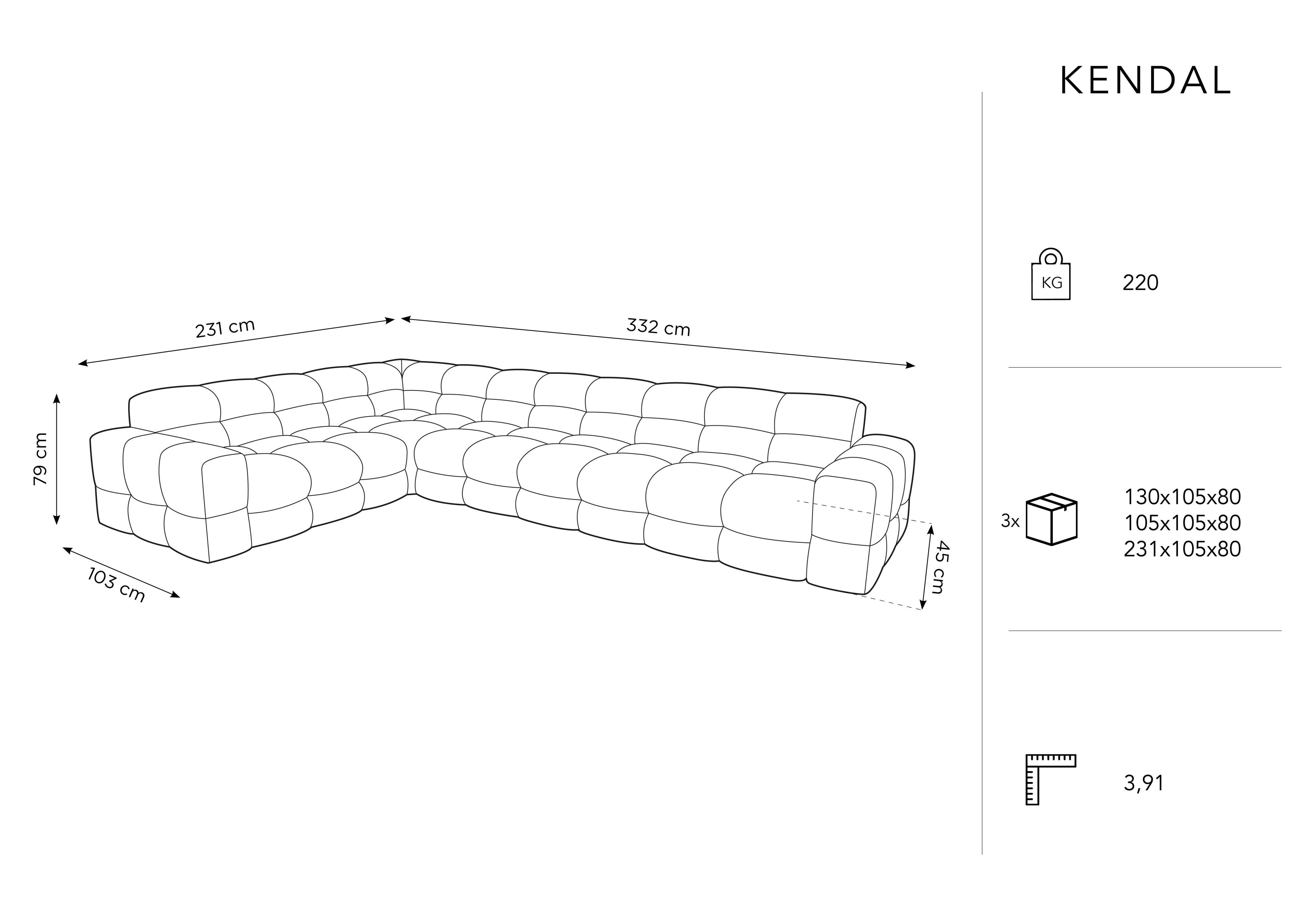 Samet-Ecksofa für sechs Personen Kendal begeistert mit außergewöhnlichen Nähten und Steppungen, die dem Raum eine außergewöhnliche Eleganz im modernen klassischen Stil verleihen. Die blasenförmige Sitzfläche in Kombination mit der stilvollen Rückenlehne und den breiten Armlehnen schafft einen komfortablen Ort zum Entspannen nach einem langen Tag.Kendal überrascht mit einer etwas avantgardistischen Form und zieht die Aufmerksamkeit auf sich, egal von welcher Seite wir sie betrachten.