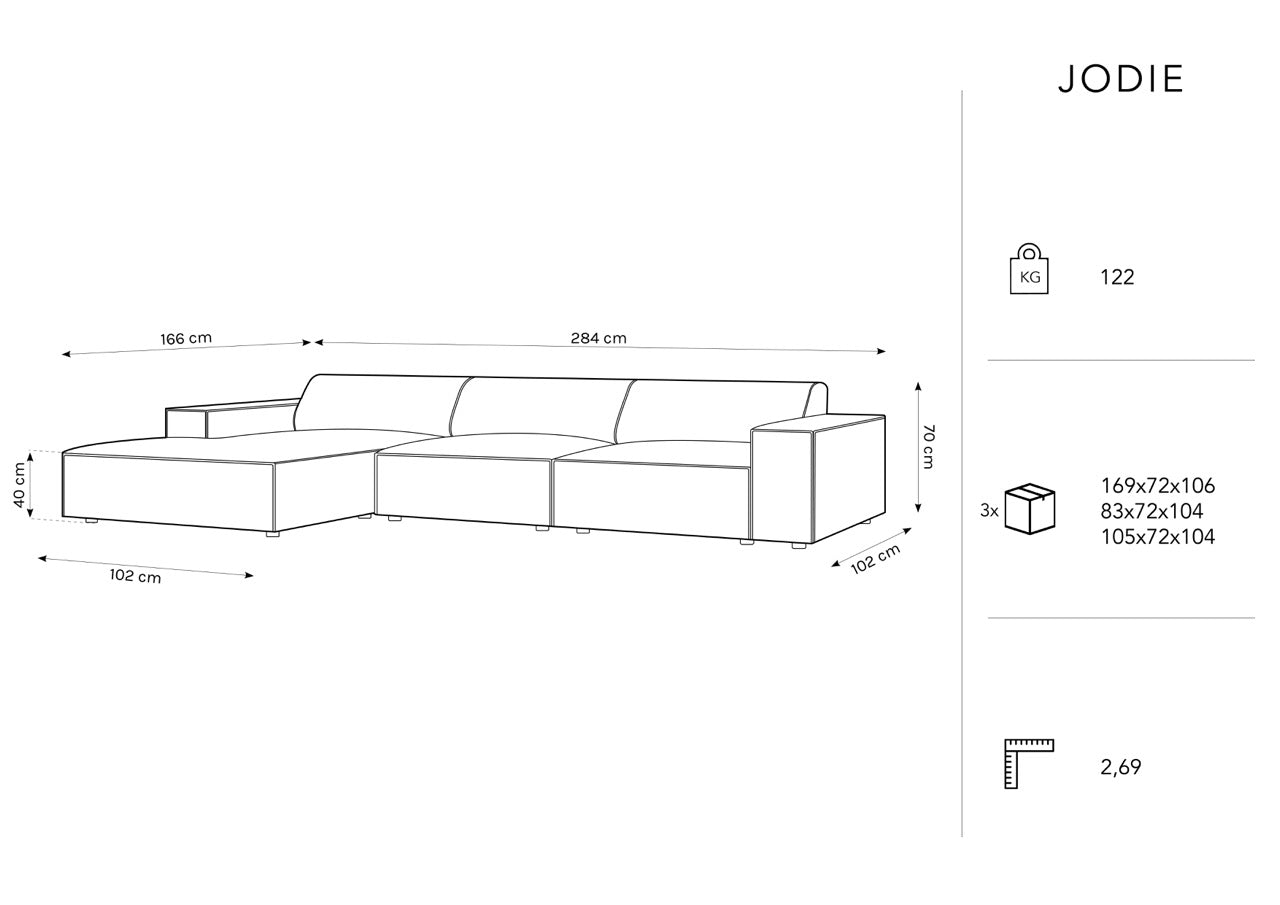Die Sitzfläche des Sofas besteht aus samtartigem Stoff, der nicht nur Komfort, sondern auch Langlebigkeit und Widerstandsfähigkeit gegen Beschädigungen garantiert. Das Jodie-Sofa ist zudem sehr praktisch - es kann je nach Bedarf mit einer linken oder rechten Seite bestellt werden.