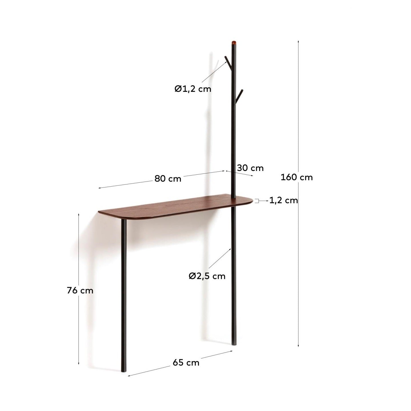 Die Oberfläche der eleganten Konsole, gefertigt aus Eichenfurnier in Nussbaumfarbe, verleiht ihr nicht nur einen besonderen Charakter, sondern hebt auch die natürliche Schönheit des Holzes hervor. Der Stahlrahmen in mattschwarz harmoniert perfekt mit dem Holz und schafft eine harmonische Verbindung von Modernität und Wärme.