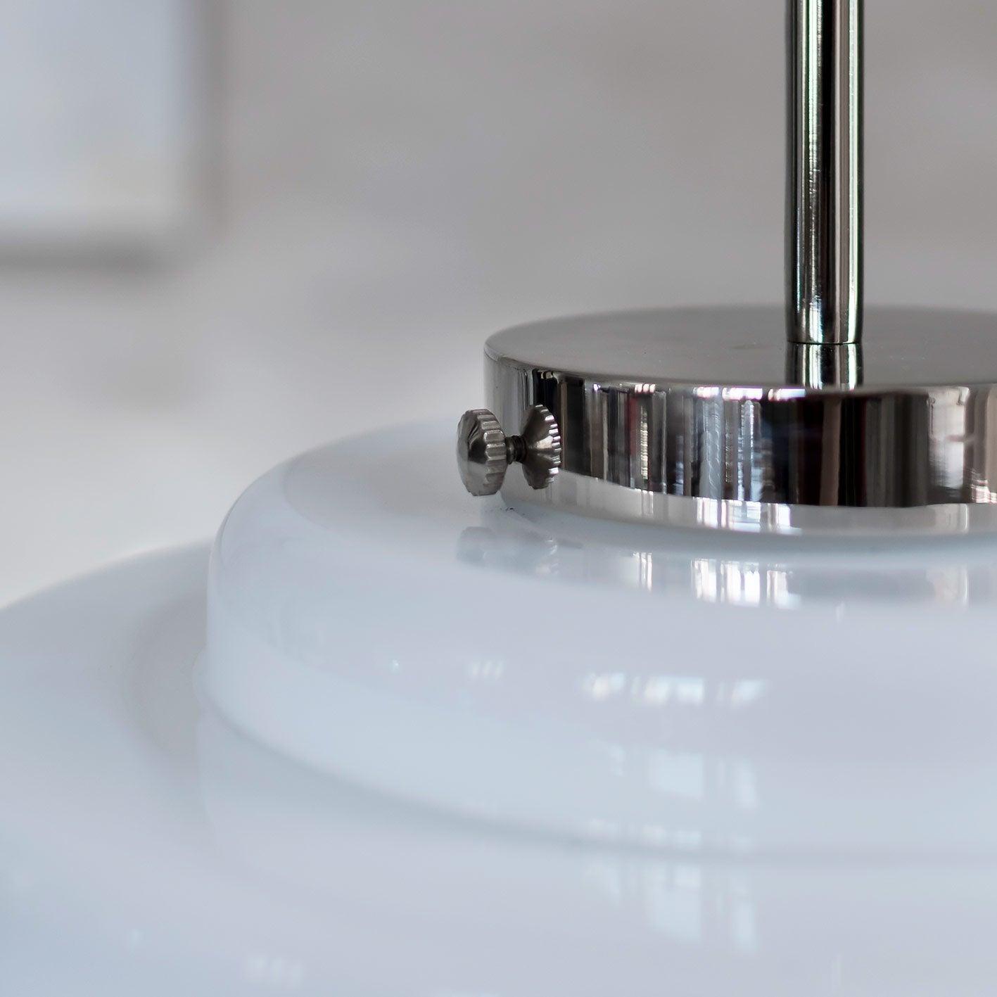 Die Herstellung des Schirms der Mémoire-Lampe wurde lokalen polnischen Glasmachern anvertraut, die auf traditionelle Weise den milchig-weißen Schirm geblasen haben. Durch das dreischichtige opale Glas erhält das Licht eine außergewöhnliche Weichheit und schafft eine äußerst sinnliche, beruhigende Atmosphäre. Das Gesamtbild wird von einem Deckel aus Nickel gekrönt.