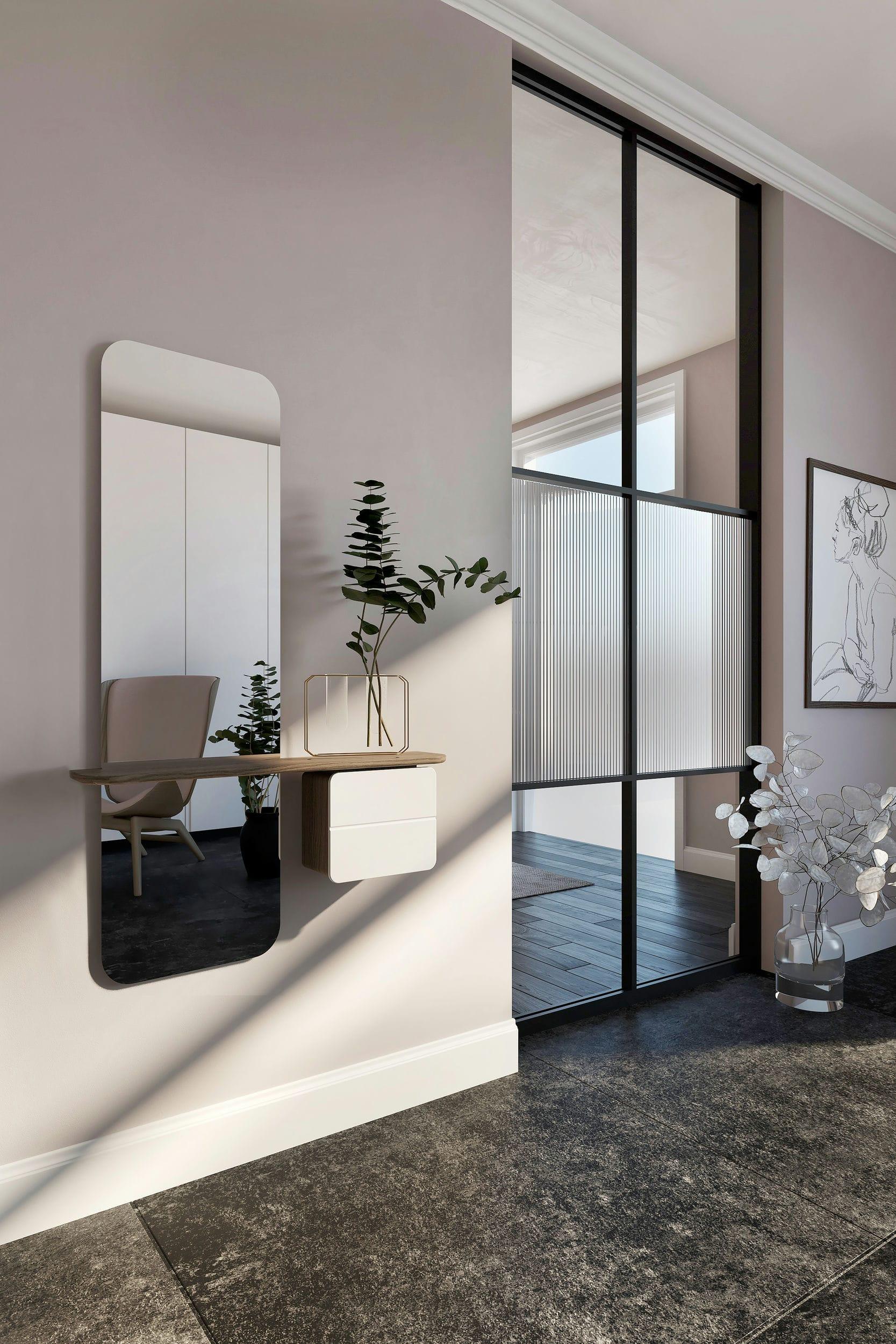 Ein weiterer Look ist klar und geräumiger Spiegel mit einem minimalistischen skandinavischen Charakter, der viele zusätzliche Funktionen hat, die die täglichen Bedürfnisse des städtischen Lebens erfüllen. Wenn Sie den Mindestraum erhöhen, ist ein weiterer Look ideal für Korridore jeder Größe, funktioniert jedoch auch perfekt in Schlafzimmern, Hotels und Bürokorridoren.
