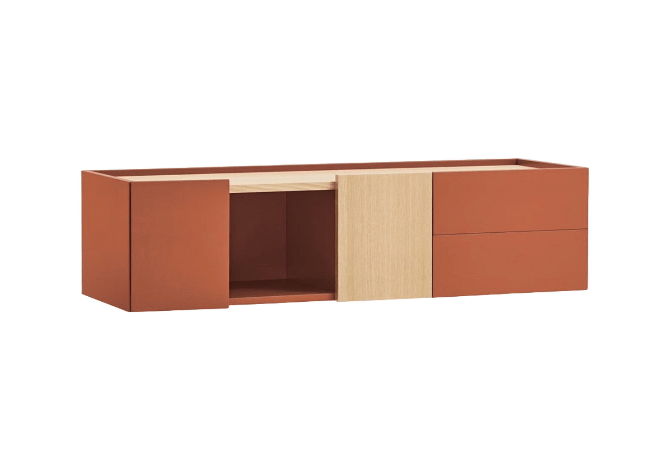 Hängeschrank Otto in der Zimtfarbe zeichnet sich durch einen modernen Stil mit klaren Linien aus, in dem sich der warme Zimtschatten harmonisch mit den Akzenten des natürlichen Furniers verbindet, die es ermöglicht, es an verschiedene Räume anzupassen. Sein Design wurde speziell für die Funktionalität entwickelt - es verfügt über ein Paar einzelner Türen, zwei Schubladen und einen offenen Raum, der eine effektive Speicherung verschiedener Objekte ermöglicht.