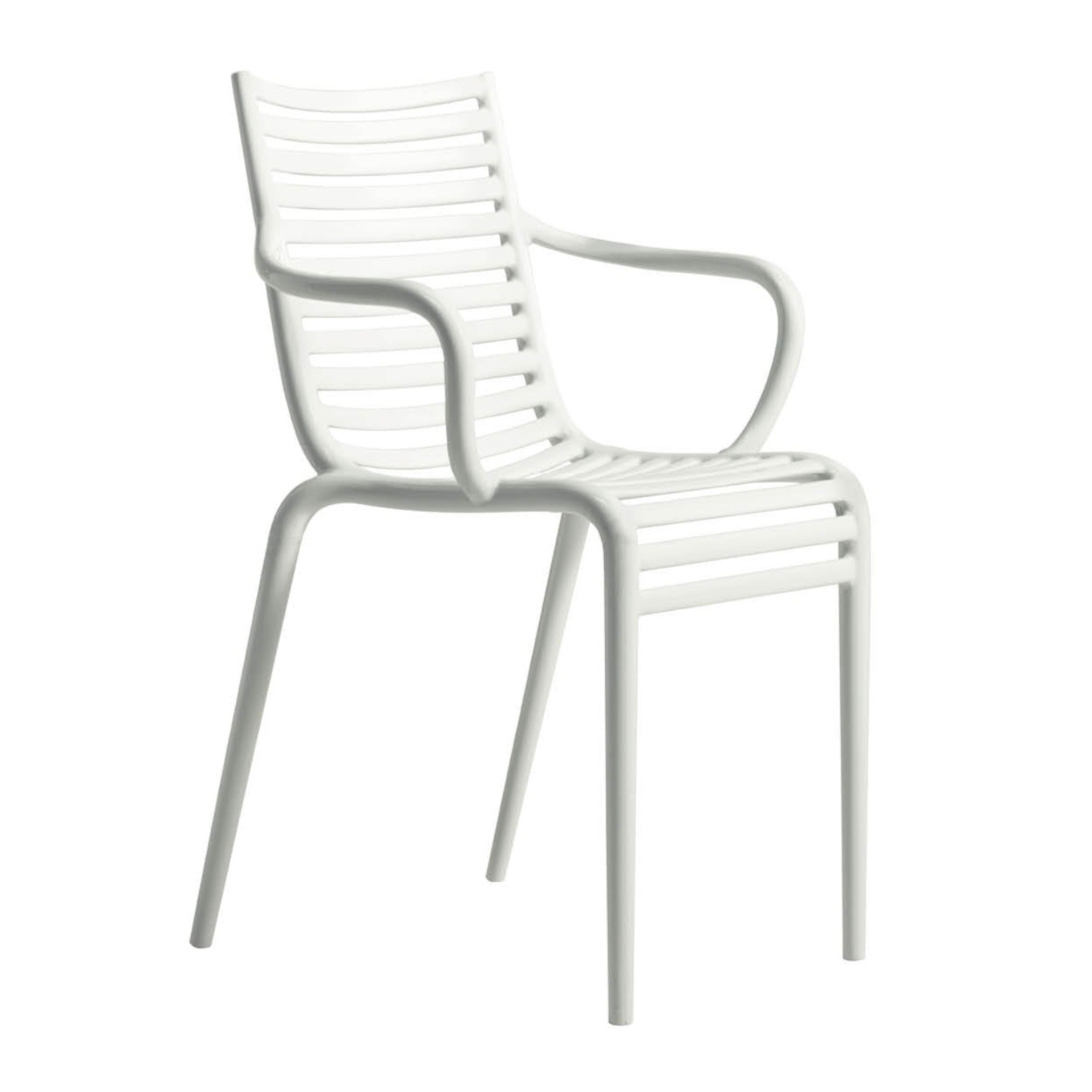 Stuhl Pip-E ist eine klassische Form in einer modernen Ausgabe von Philippe Starck. Die charakteristischen horizontalen Lamellen, die den Rücken und den Sitz bilden, verleihen ihm einen grafischen Ausdruck und einen interessanten Effekt von Chiaroscuro, und ihr ergonomisches System unterstützt die Figur perfekt und erleichtert die Anordnung der Beine. Ein einfaches und ausdrucksstarkes Design lässt PIP-E sowohl im Innen als auch im Außenbereich zu finden.