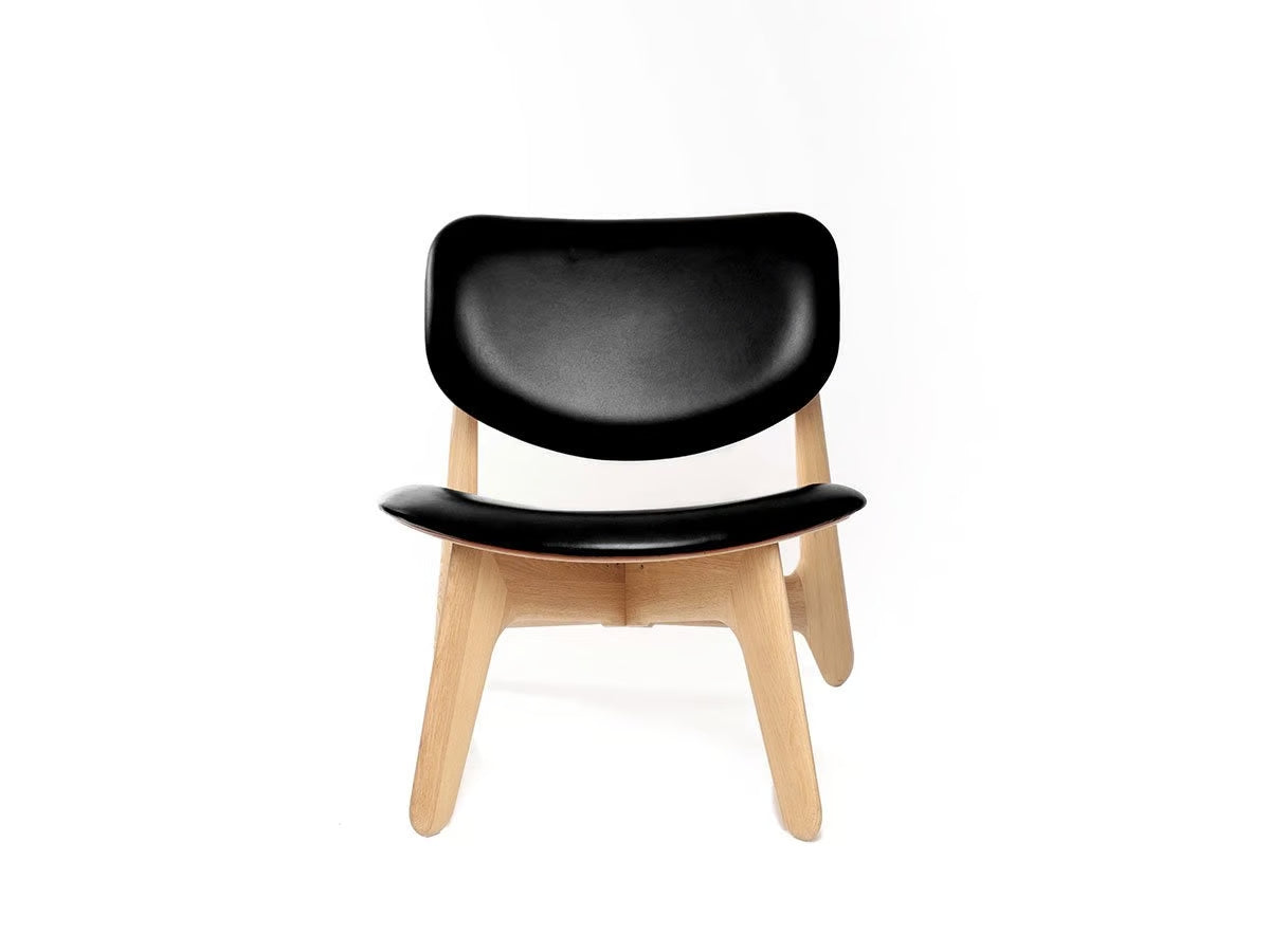 Platte Sessel schwarzes Leder mit einer Eichenbasis