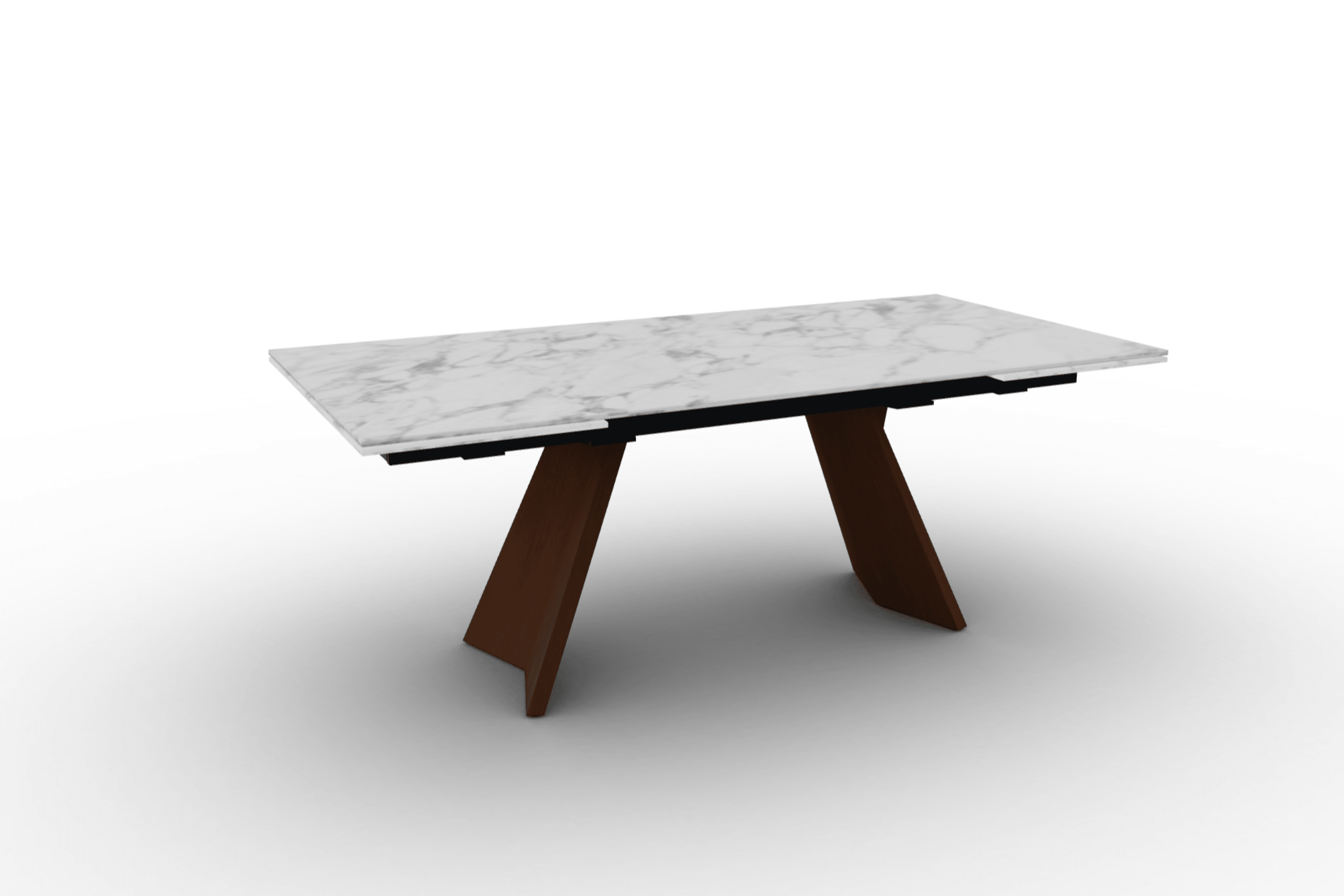 Icaro es Tisch mit einem Keramikoberteil und dem Bau einer Basis aus furniertem Holz.