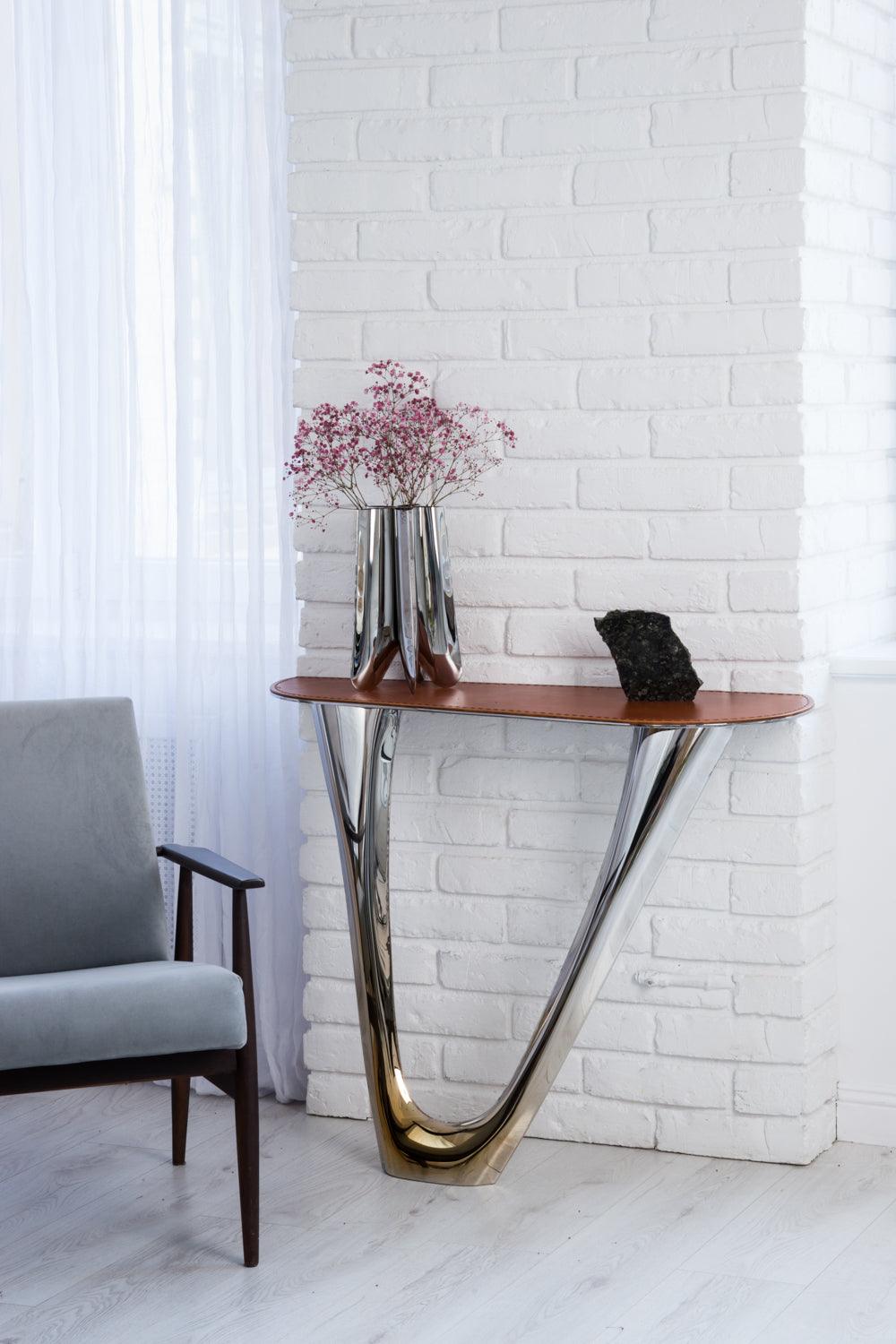 Vase Rotation ist ein hervorragendes Beispiel für die Verbindung von Kunst und Funktionalität. Ihre Stahlform und ihr einzigartiges Design ziehen die Aufmerksamkeit auf sich und erfüllen gleichzeitig eine praktische Rolle bei der Präsentation und Betonung der Schönheit der Blumen. Es ist ein Objekt, das mit seiner Eleganz und Ausdruckskraft begeistert und dem Raum einen besonderen Charakter und eine einzigartige Note verleiht.