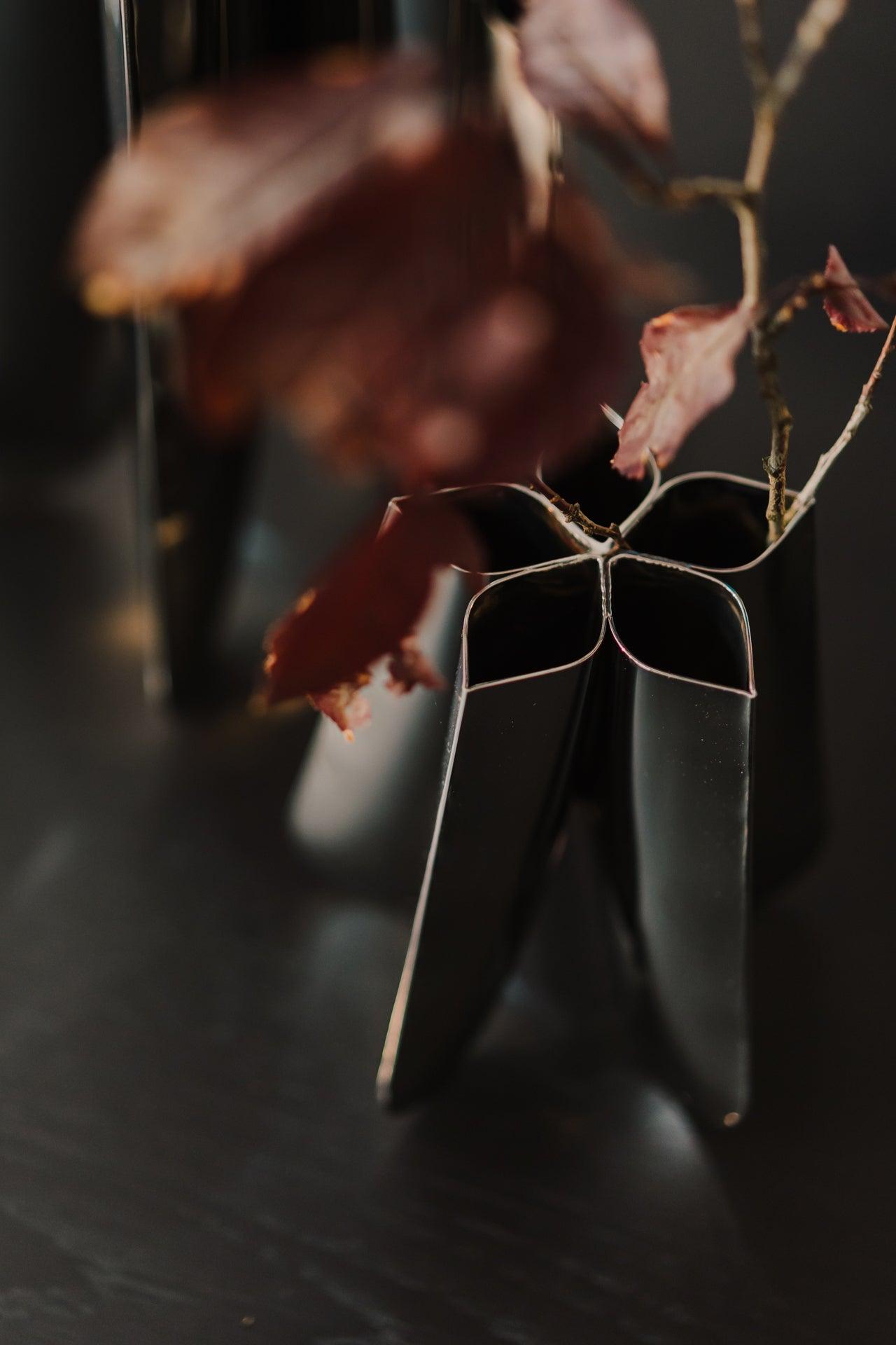 Vase Rotation in Edelstahl ist die Quintessenz harmonischer Wiederholung. Seine außergewöhnliche Form schafft eine geometrische Komposition um die Achse des Gefäßes und erzählt eine Geschichte durch die Pflanzenstängel. Es ist eine Stahlform, die mit Kompositionen flirtet und unerwartete Richtungen für die Blumen schafft.