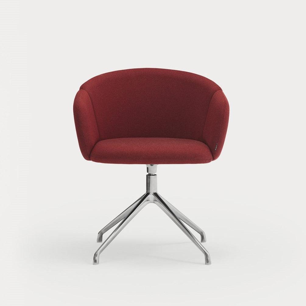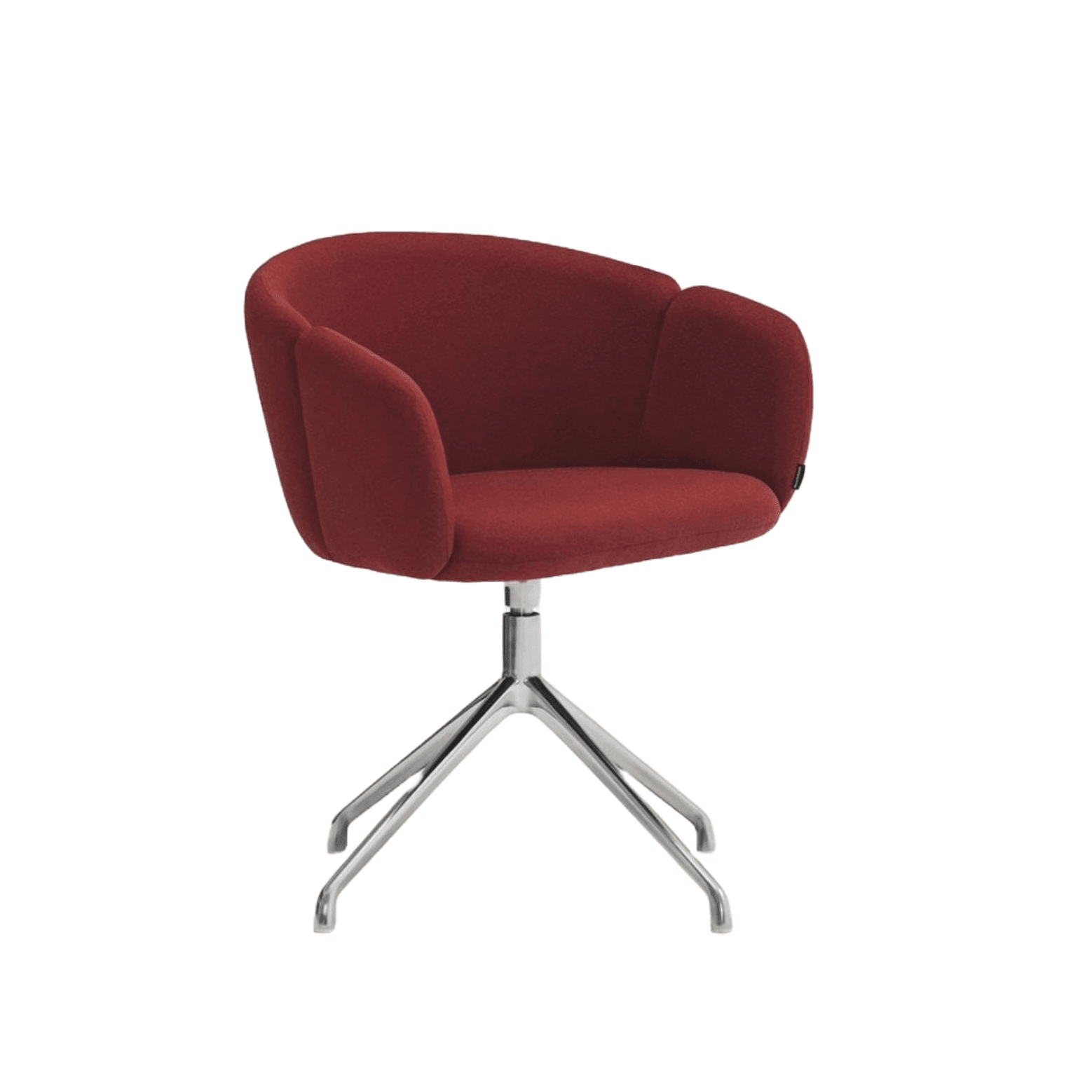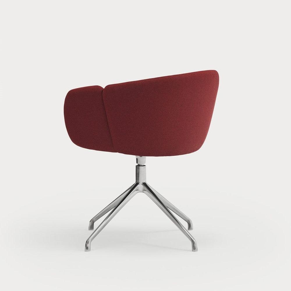 Drehstuhl mit Armlehnen Add in rotem Stoff ist nicht nur ein elegantes Einrichtungselement, sondern auch eine Garantie für außergewöhnlichen Komfort und ergonomische Unterstützung. Bei der Gestaltung dieses Stuhls war es das Ziel, einen Ort zum Arbeiten oder Entspannen zu schaffen, der sich perfekt an die natürlichen Kurven des Körpers anpasst. Die vollständig gepolsterte Rückenlehne biegt sich sanft und umhüllt den Benutzer, was eine freie Bewegung und Positionsänderung ermöglicht dank