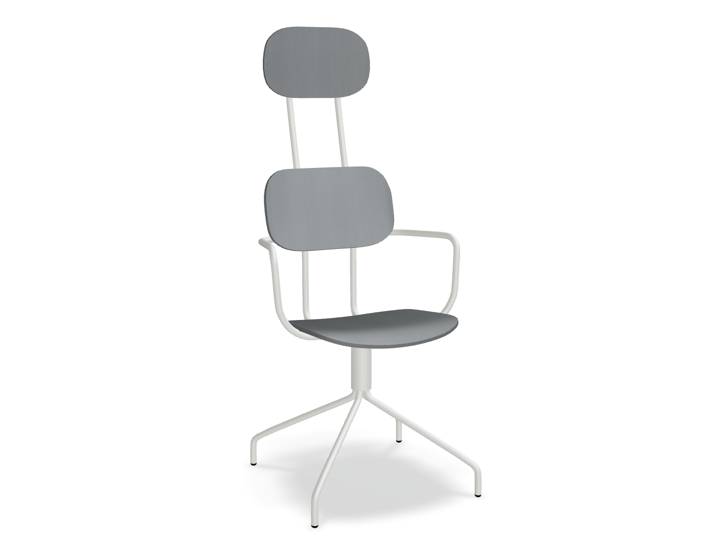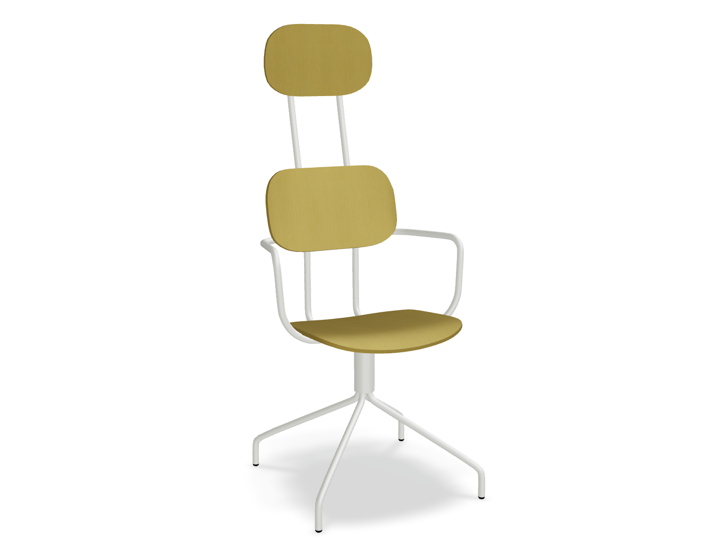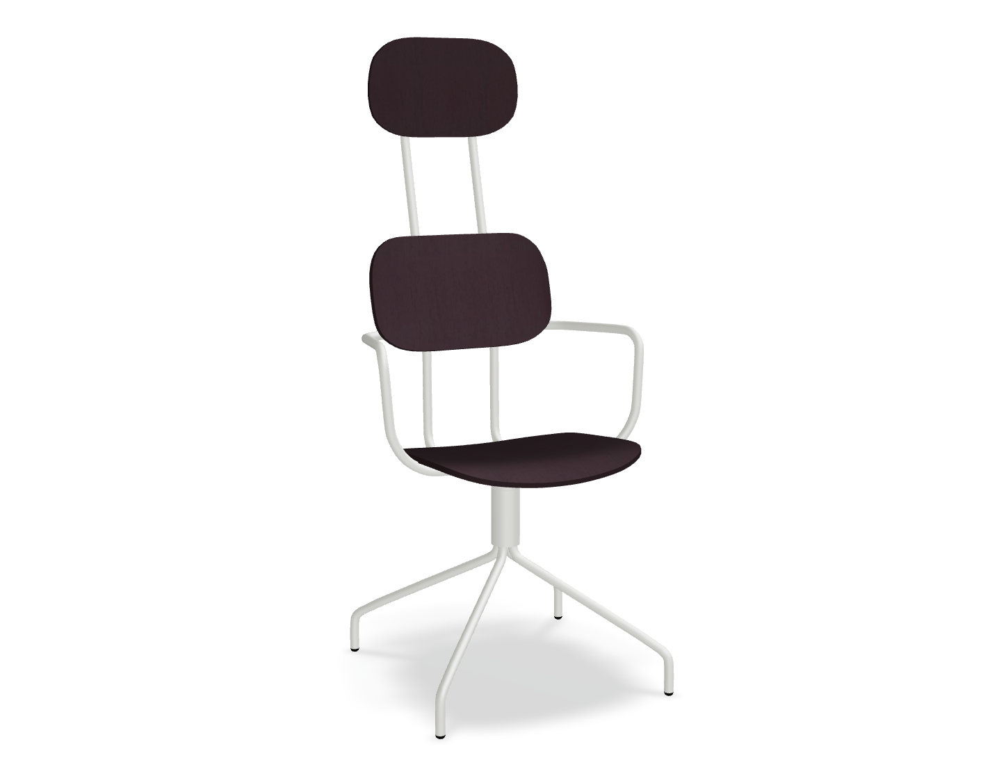 Drehstuhl Die neue Schule mit einer Kopfstütze, die von Studio mit Liebe entworfen wurde, zieht die Aufmerksamkeit mit einer modernen Form mit doppelter Unterstützung auf sich. Diese Rückenlehne betont nicht nur das moderne Design, sondern bietet auch eine hervorragende Unterstützung für den gesamten Rücken. Die rotierende Basis garantiert die Bewegungsfreiheit, und optionale Armlehnen erhöhen den Nutzungskomfort weiter. Die Sperrholzversion zeichnet sich durch Haltbarkeit und Leichtigkeit der Pflege aus, was sie zu einer idealen Wahl für den Raum viele Menschen macht.