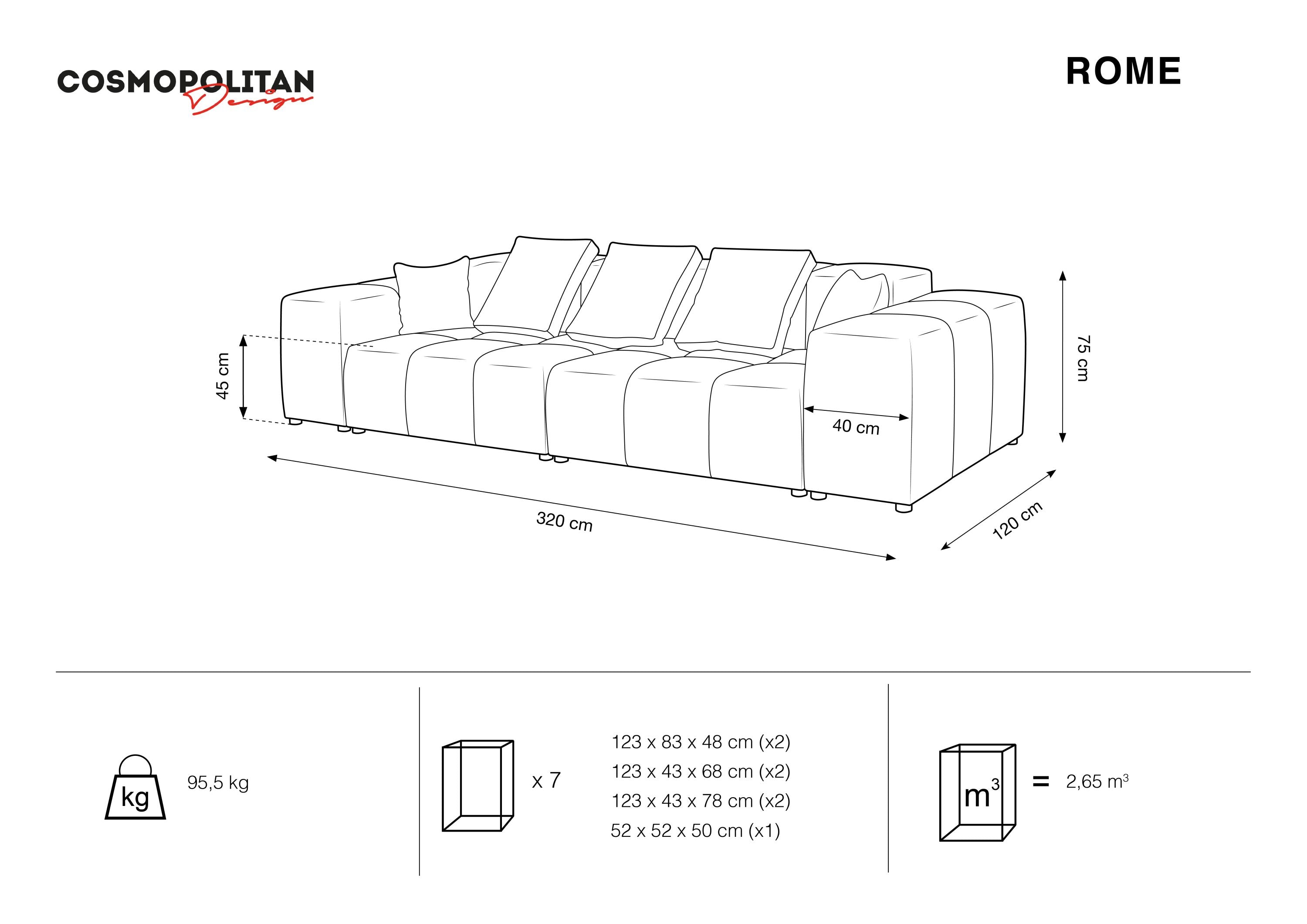 ROME ist eine außergewöhnliche Verbindung von Eleganz, Komfort und Modernität. Das Sofa ist mit einem schönen, luxuriösen Stoff bezogen, und seine einzigartige Farbe schafft unzählige Gestaltungsmöglichkeiten. Das Sofa sieht nicht nur großartig aus, sondern fühlt sich auch sehr angenehm an und ist abriebfest.